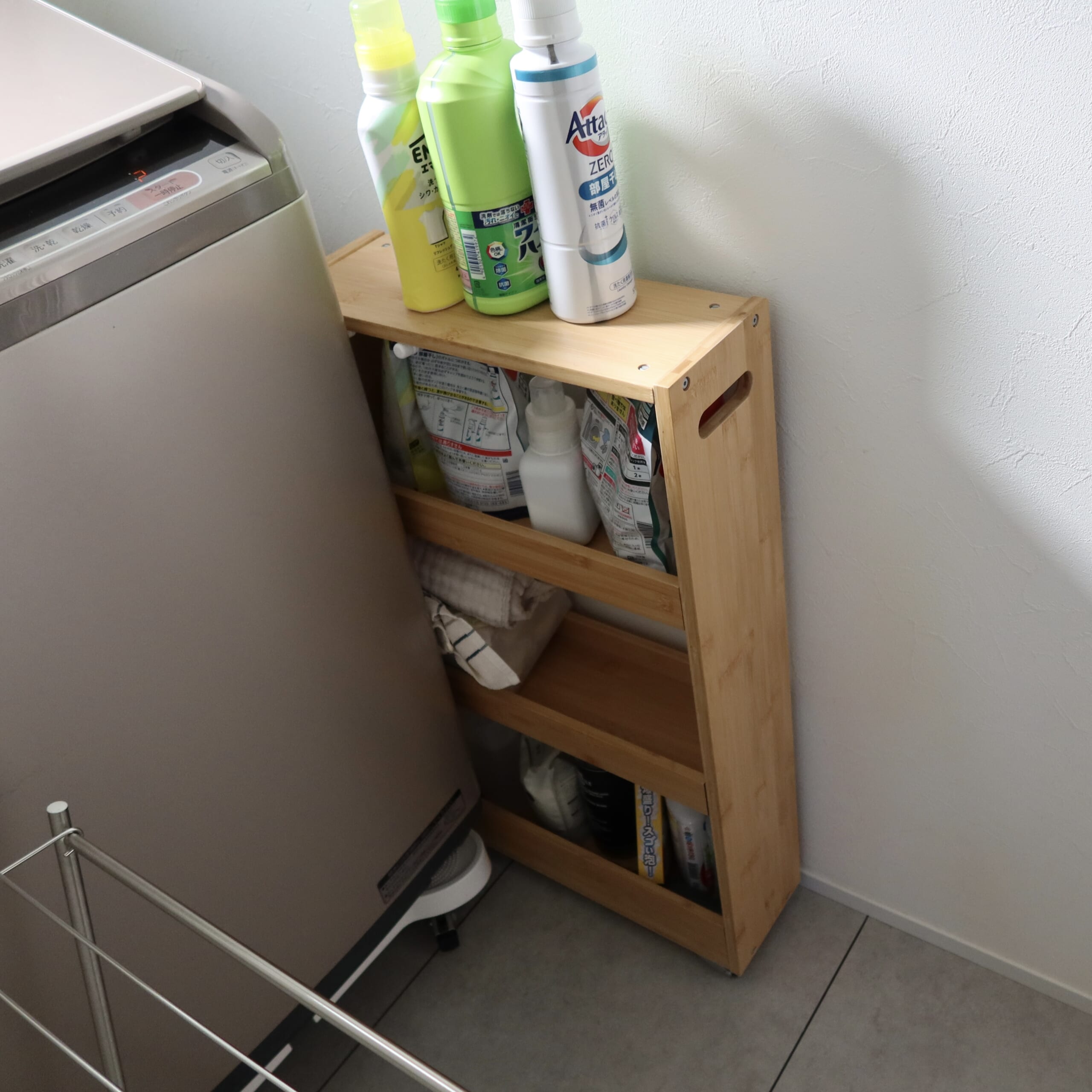 壁と洗濯機の隙間に入る上に収納力も高く、かなり気に入っています。
