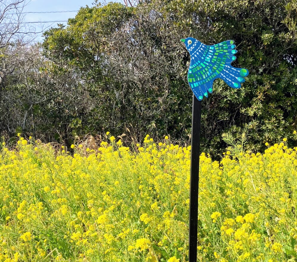 園内のあちこちに、地元の園児たちやワークショップの参加者が制作した青い鳥のオブジェが配置されています。