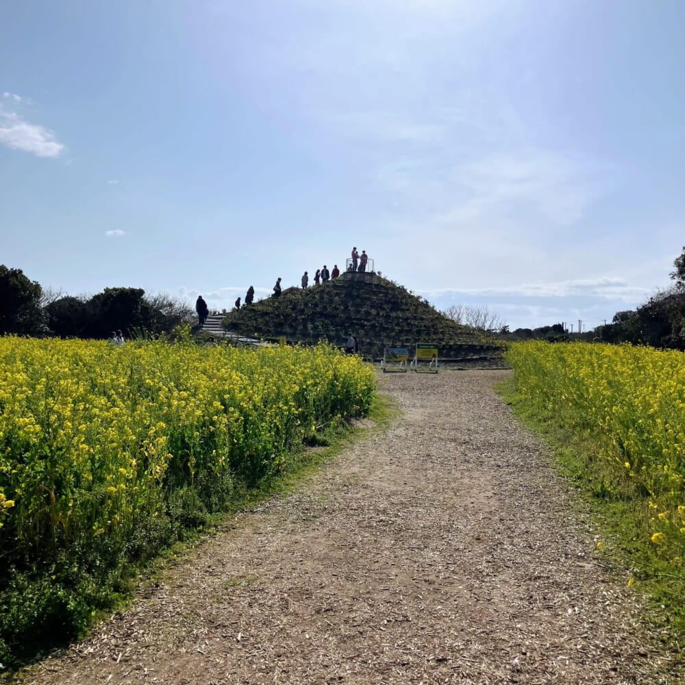 少し高い位置から見下ろすと、菜の花の黄色、そしてその向こうに広がる太平洋の深いブルー。