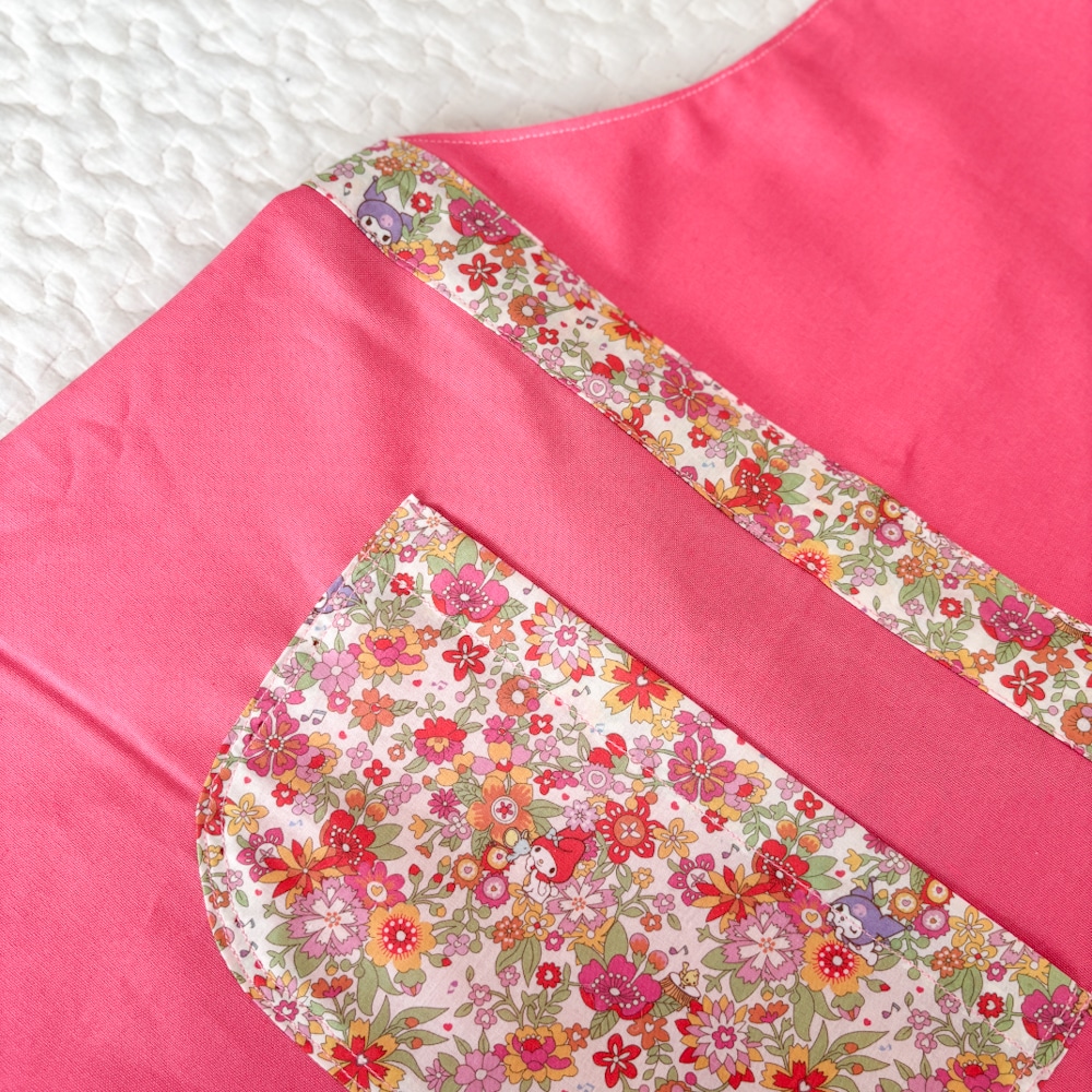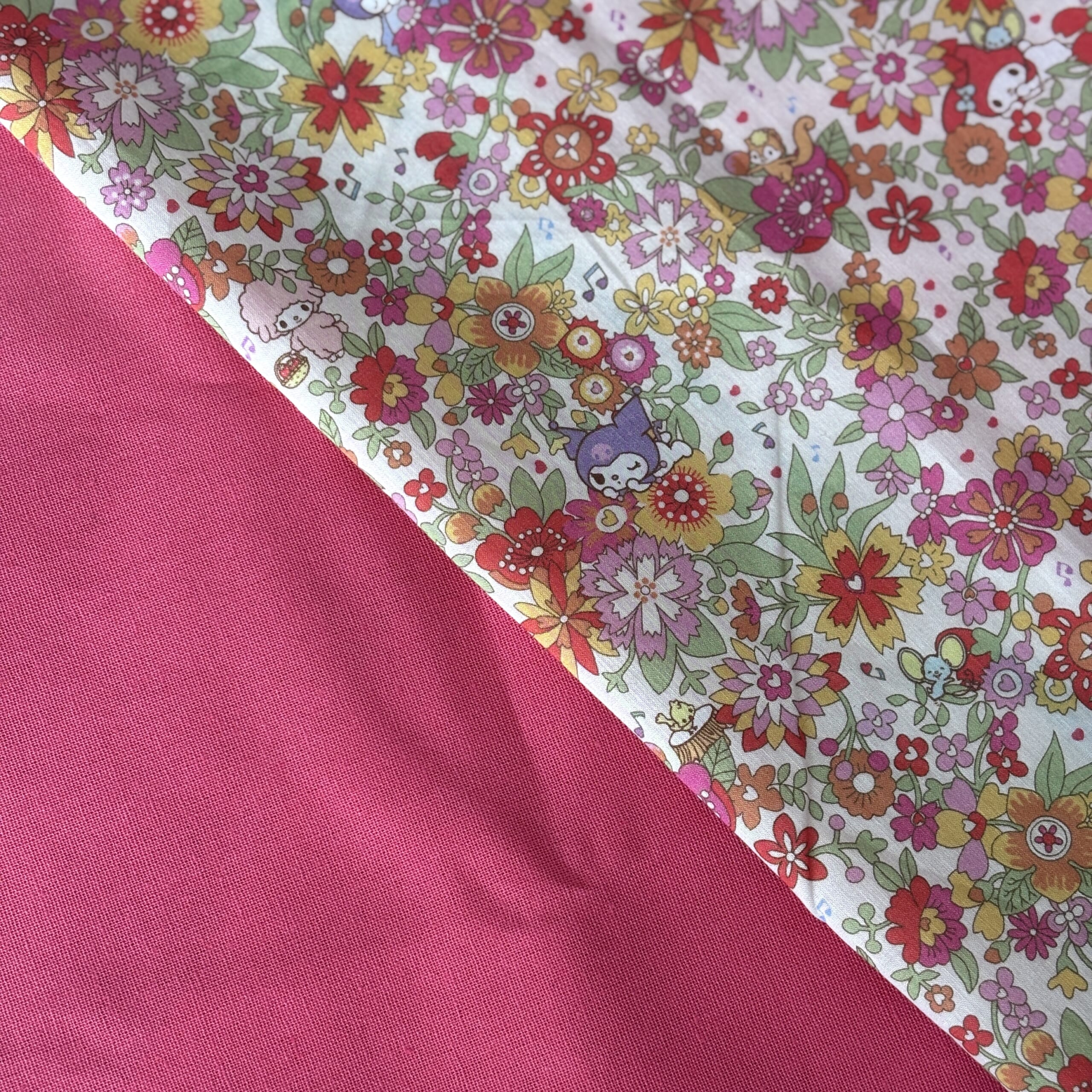 リバティと無地の生地と合わせて作ることにしました。生地はどちらもユザワヤさんで購入しました。リバティは「マイフローラルフレンズ」という柄。マイメロみたいな濃いピンク色の生地はシーチングです。