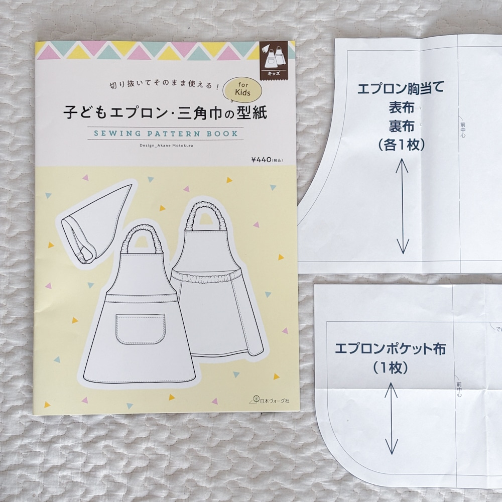 型紙は日本ヴォーグ社の「子どもエプロン・三角巾の型紙」を使いました。実物大の型紙が入っていてるので切り抜いてすぐに使えます。作り方の説明も丁寧で分かりやすかったです。