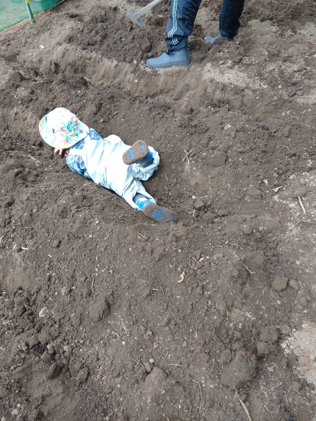 苦土石灰を混ぜ一週間。その間、YouTubeやらネットで調べるもあまりの情報の多さに目をやられしょぼしょぼ、頭もぷしゅぷしゅさせていた。わかるようでわからない。何が正解なのか。ざっくりとした工程とぼんやりとしたイメージを携え、家族3人で3月まんなかの気温13度の畑へと向かう。