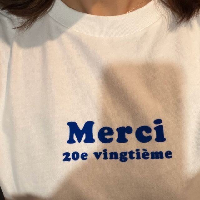 「merci 20e vingtieme」(仏語でありがとう20周年)のロゴが可愛いTシャツです。