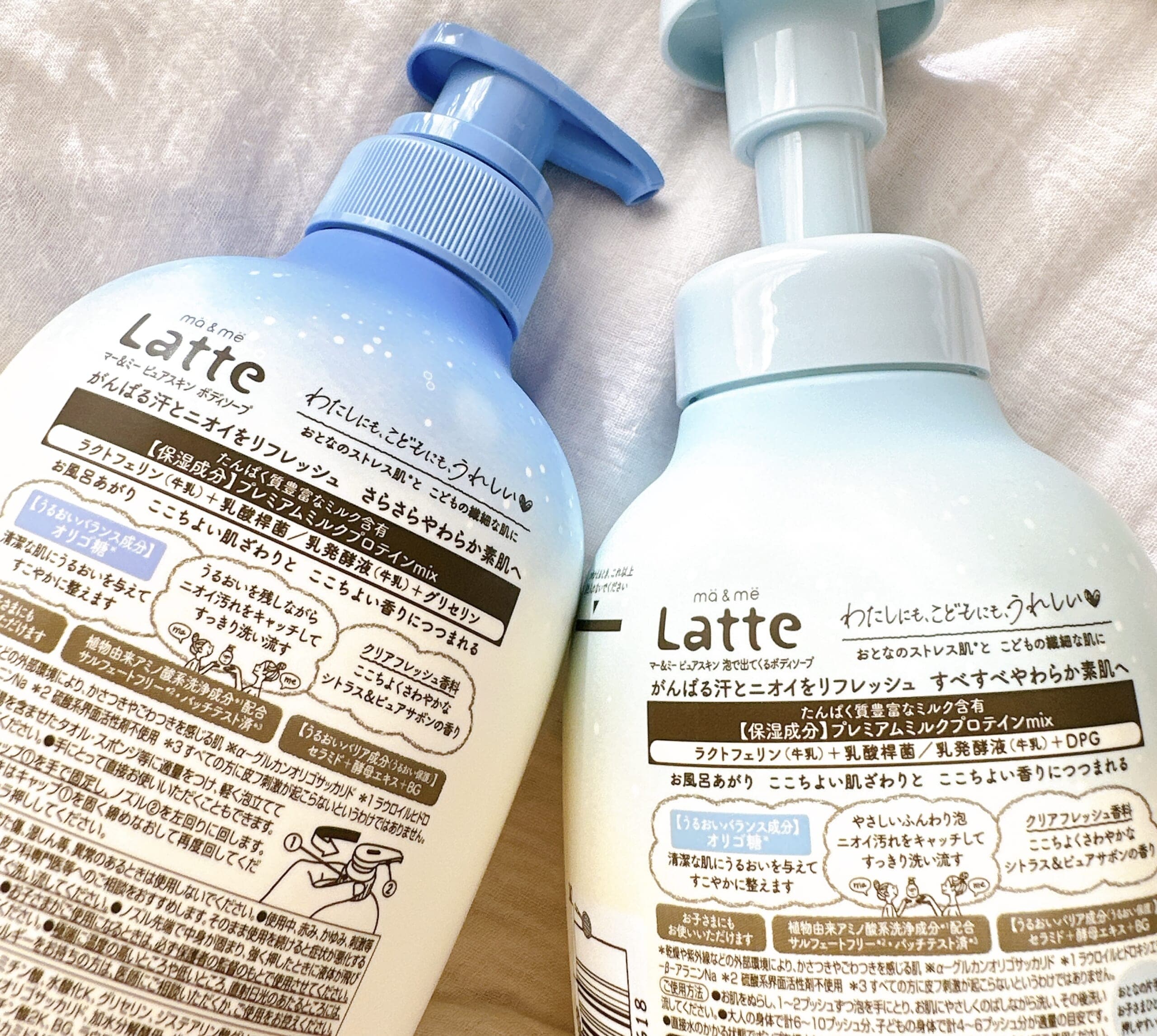 以前から「mä&më Latte」 のボディソープ、泡で出てくる ボディソープは販売されていましたが、今回発売された「ピュアスキン」ラインは、ニオイケアが気になる親子におすすめなんです。