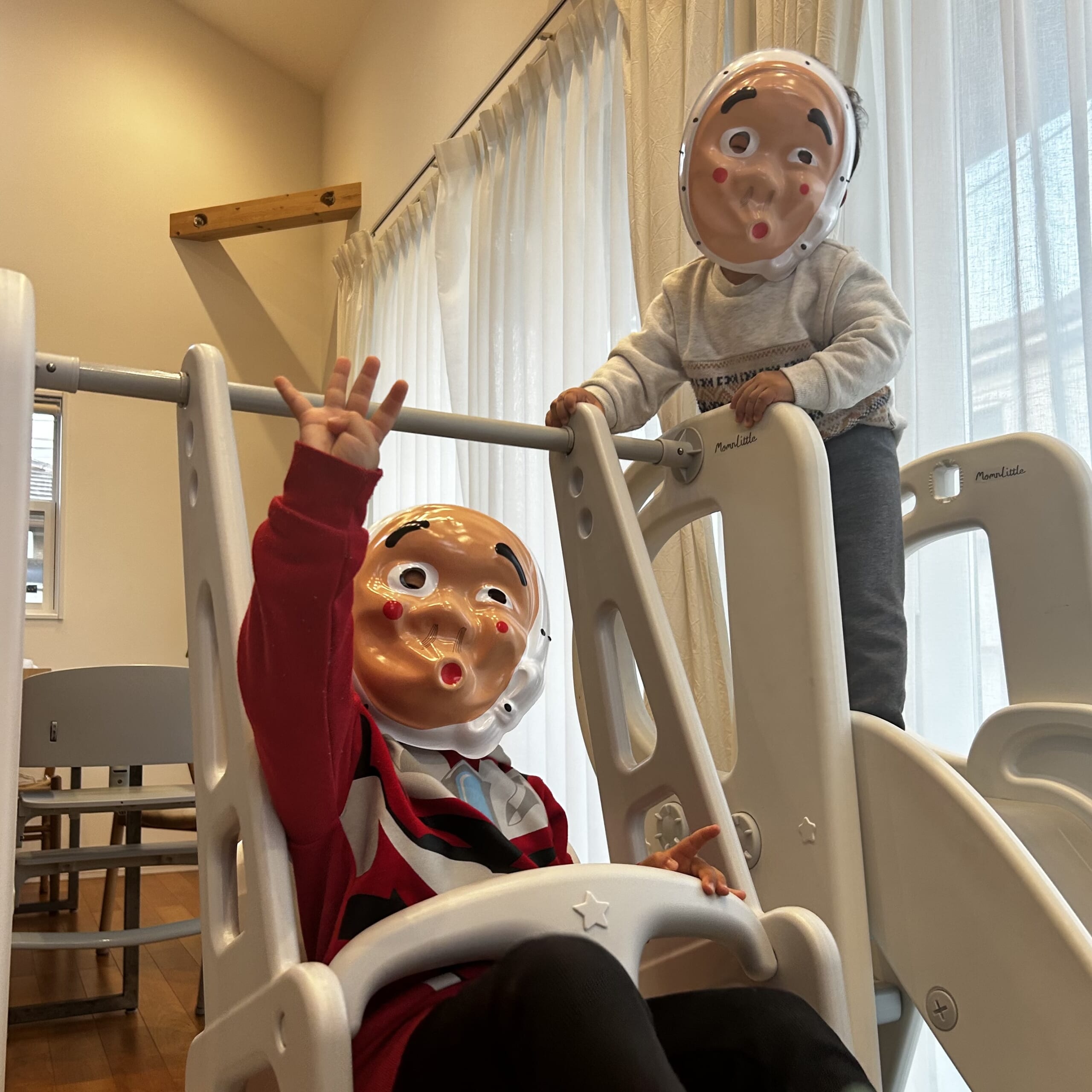 息子たちはウルトラマンごっこやハンターごっこ、お面を被って走り回ることが大好き!とにかく動きが激しいので、一緒に遊んでいると子どもたちは大汗で大人も汗だくに。