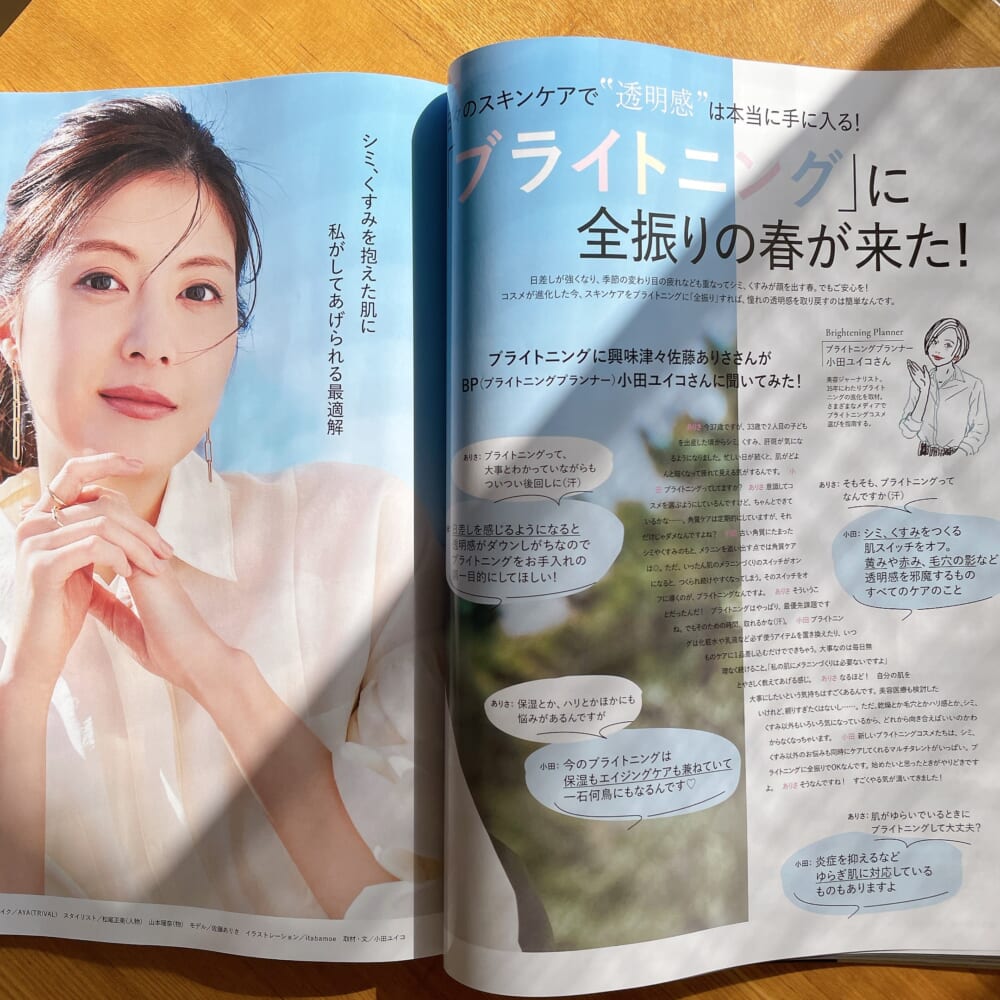 そんなワガママアラフォーの私ですが、今月号にはいつものスキンケアでコツコツお肌を育てていけるブライトニングアイテムがたくさん紹介されていました!