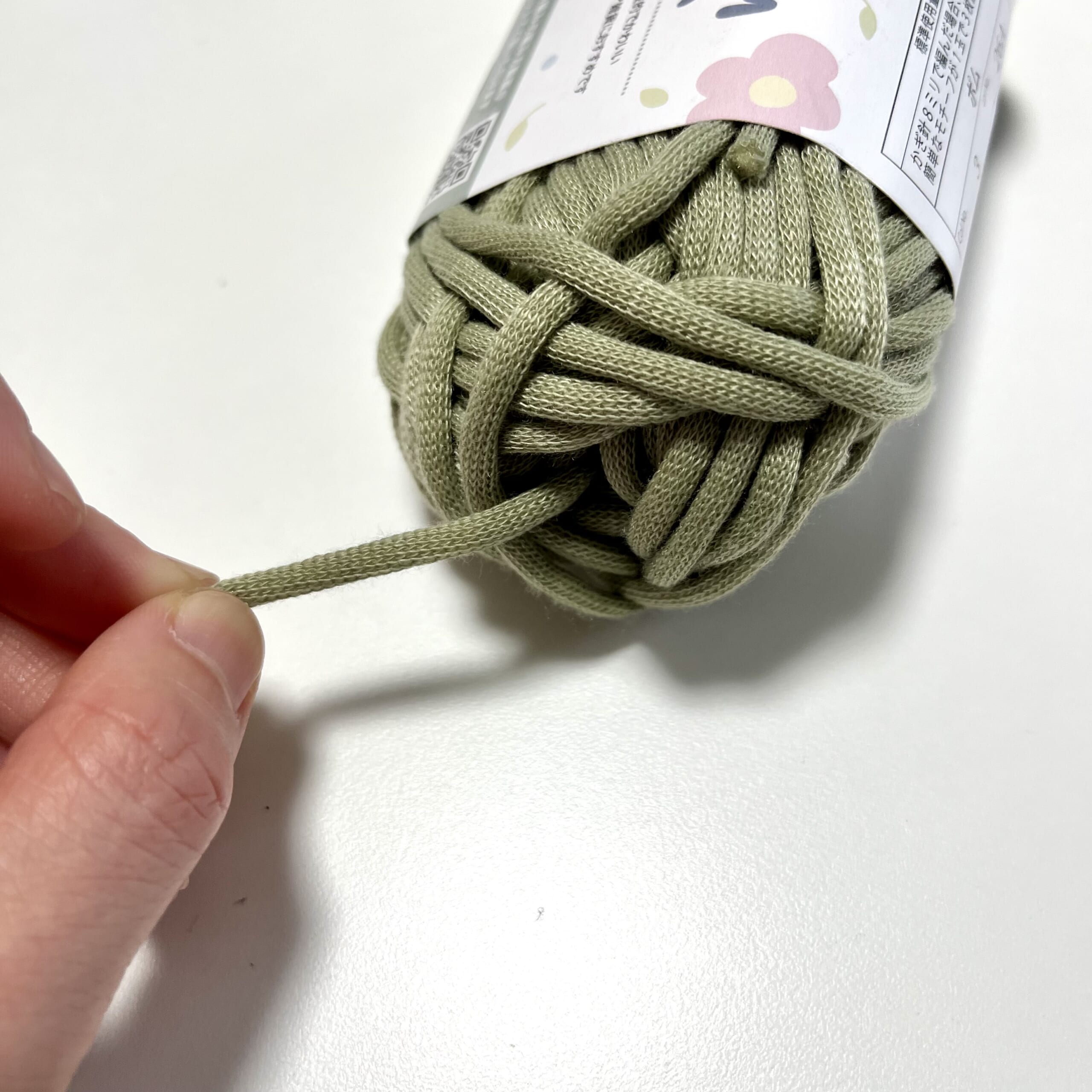 毛糸コーナーで見つけた、Tシャツヤーンのような素材。