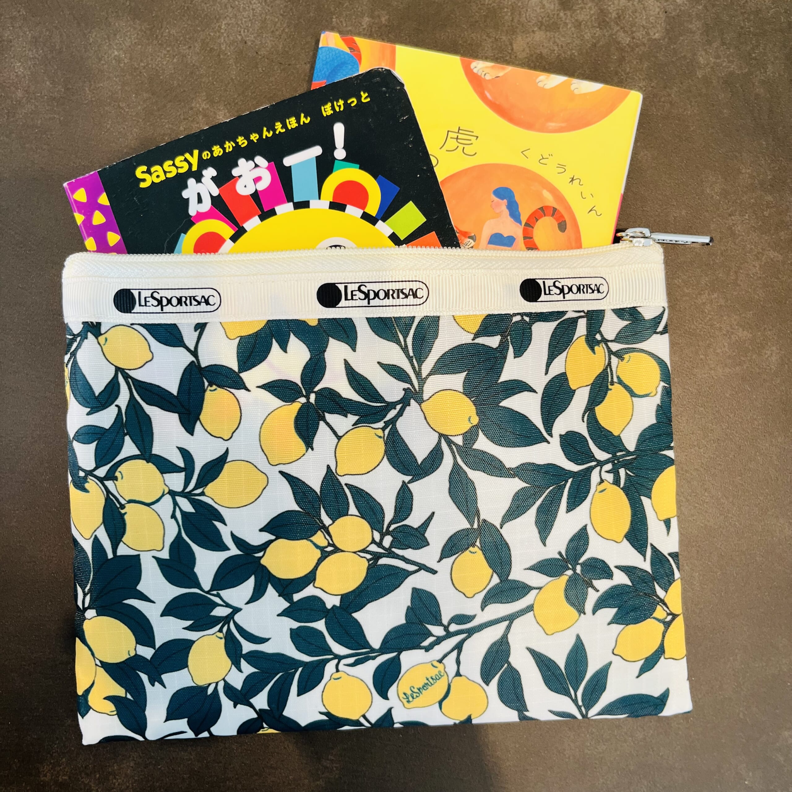 大きいポーチには、息子とのカフェタイム用に5分でも読めたらいいなと思っている本と