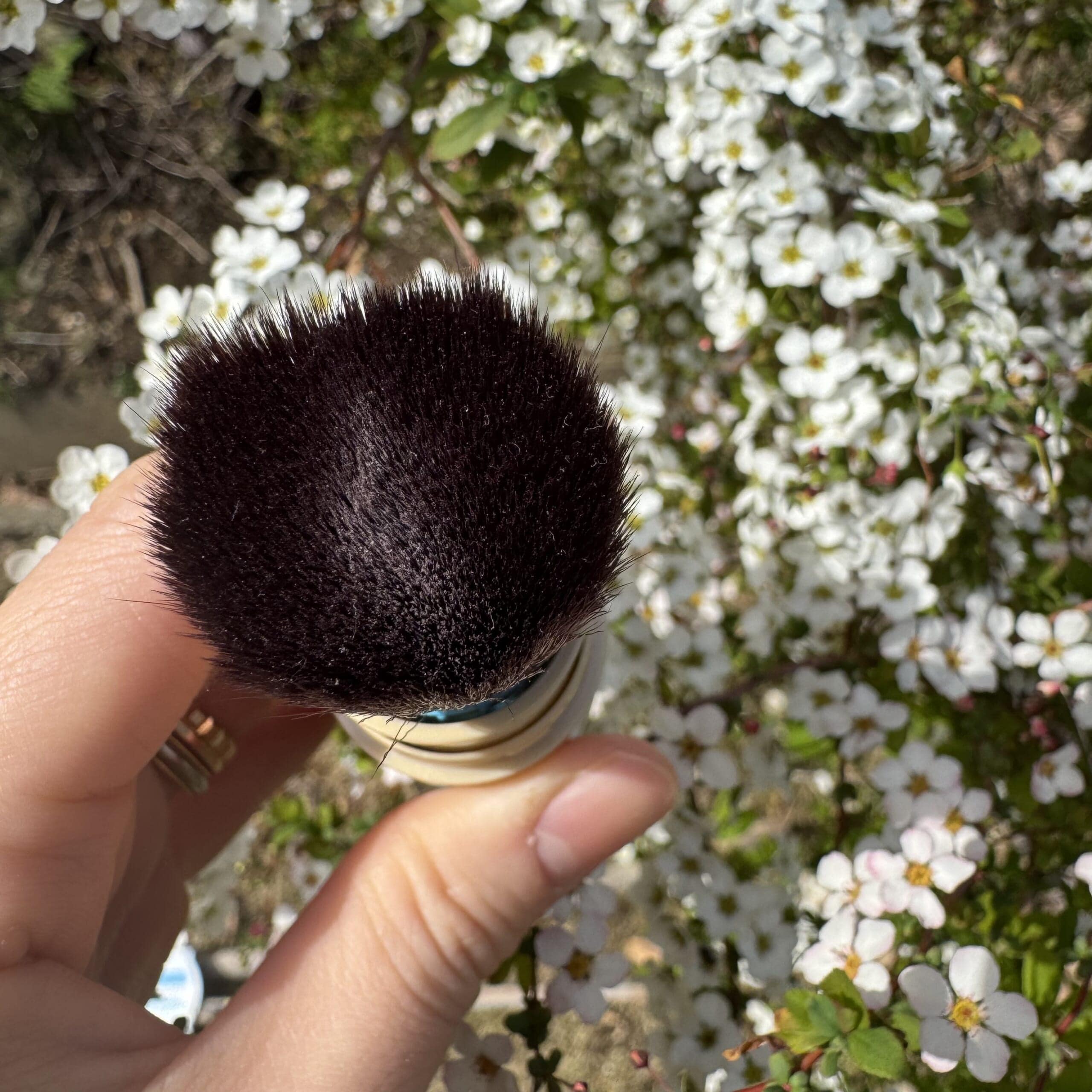 2、ブラシを払うように使うと粉が舞いやすいため、ブラシは最後に「とめる」。