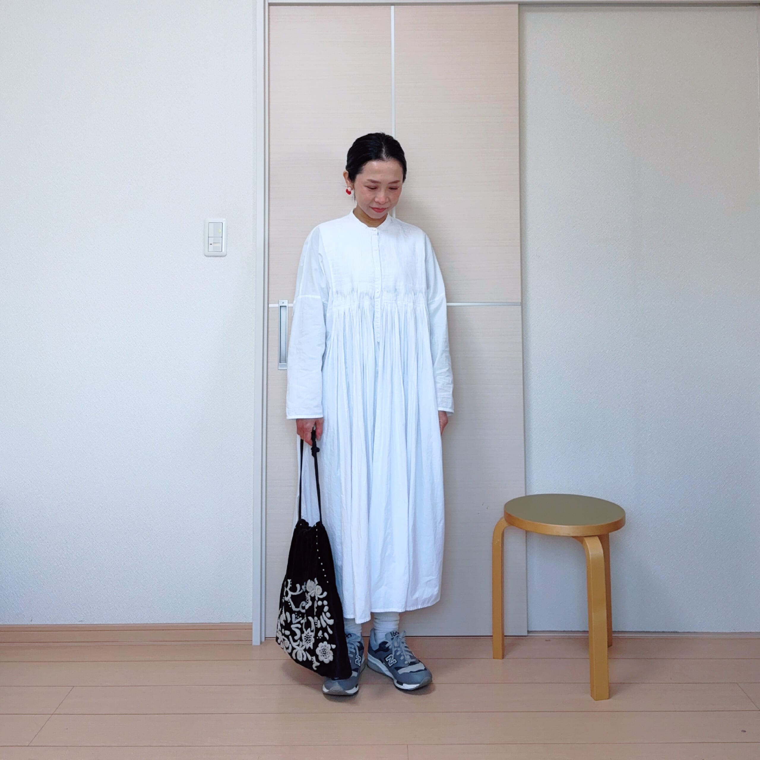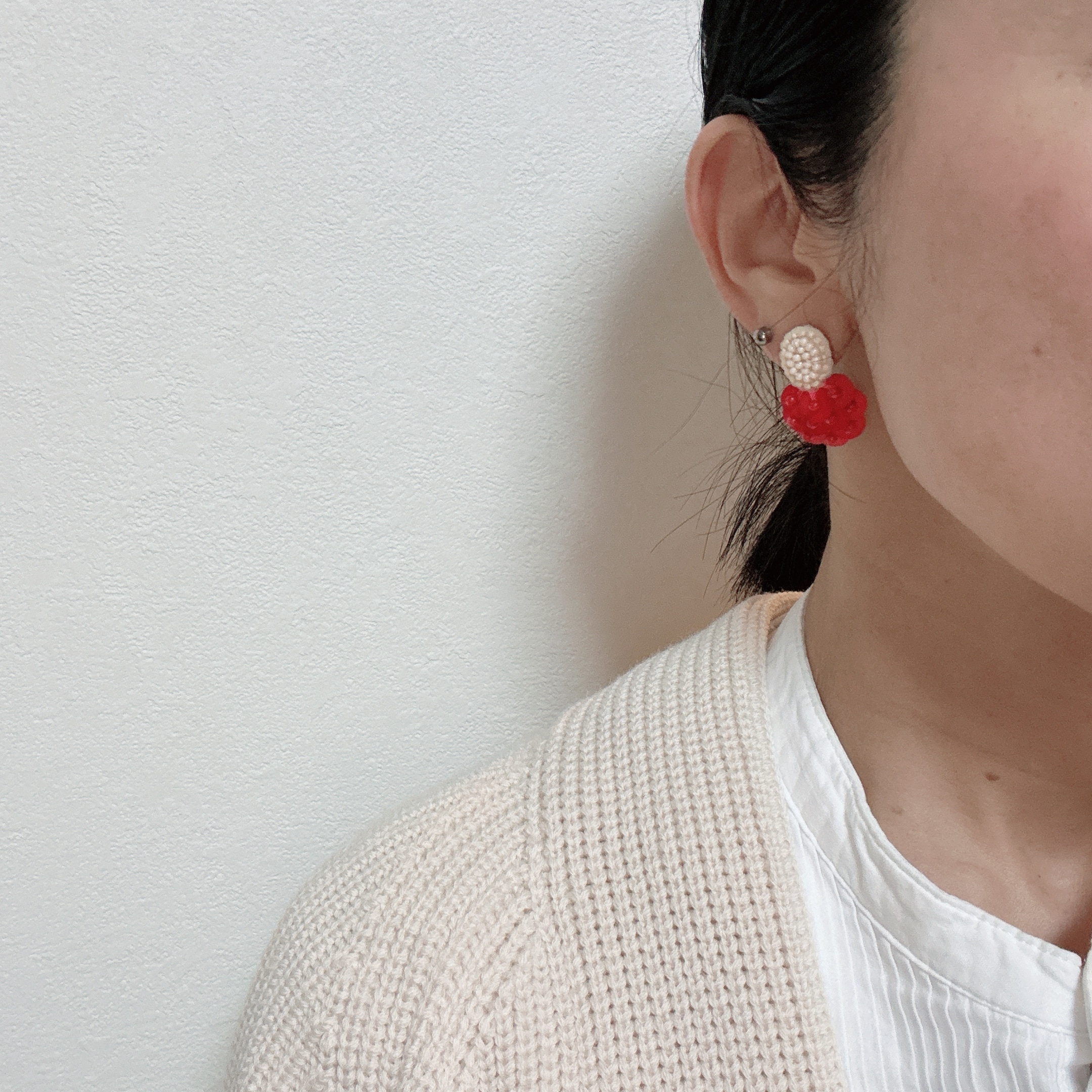 洋服がモノトーンだったので、ピアスはtamasの紅白のカラーピアスにしてみました。