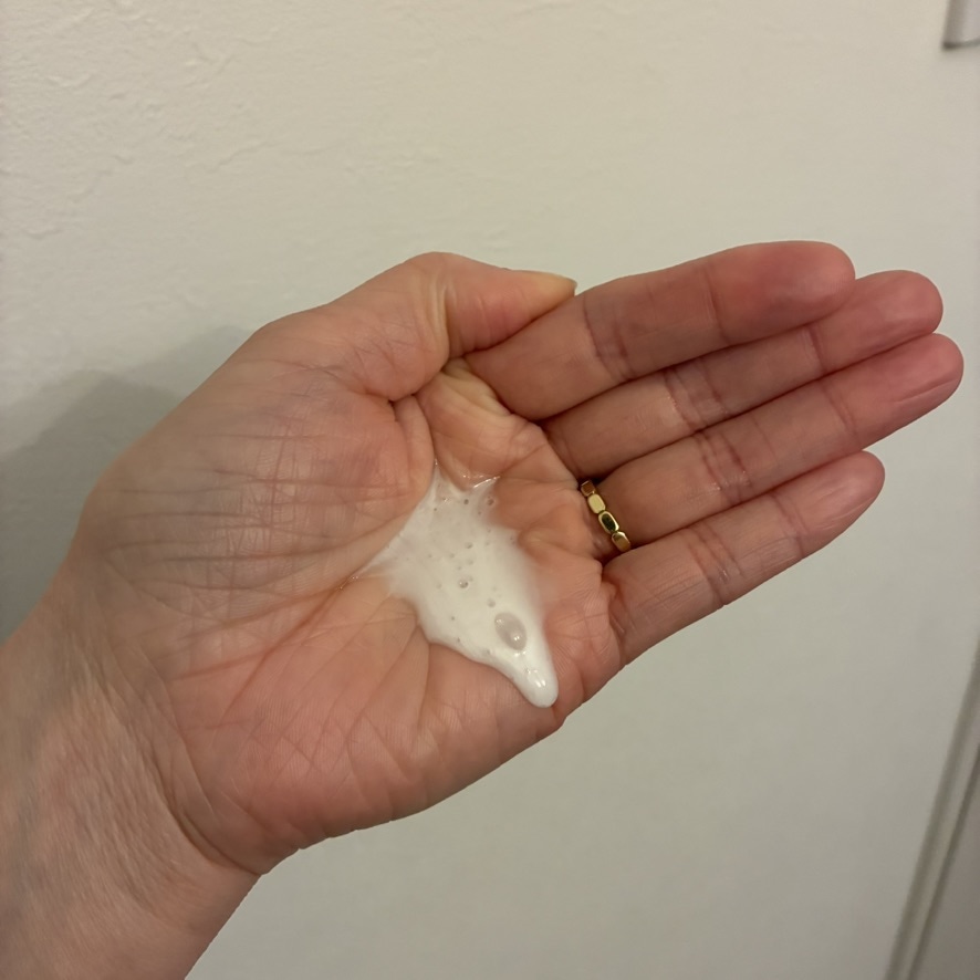 手のひらに出してみると、サラッとしたテクスチャーでした。ポンプからもスムーズに出たので、ひとりワンプッシュで十分な量だと思います♫