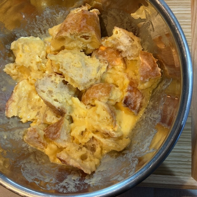 バケットを3㎝角に切り、プリン液に加えて混ぜ、バケットを押し付けるように液に浸し、小皿を被せて30分ほど室温に置く
