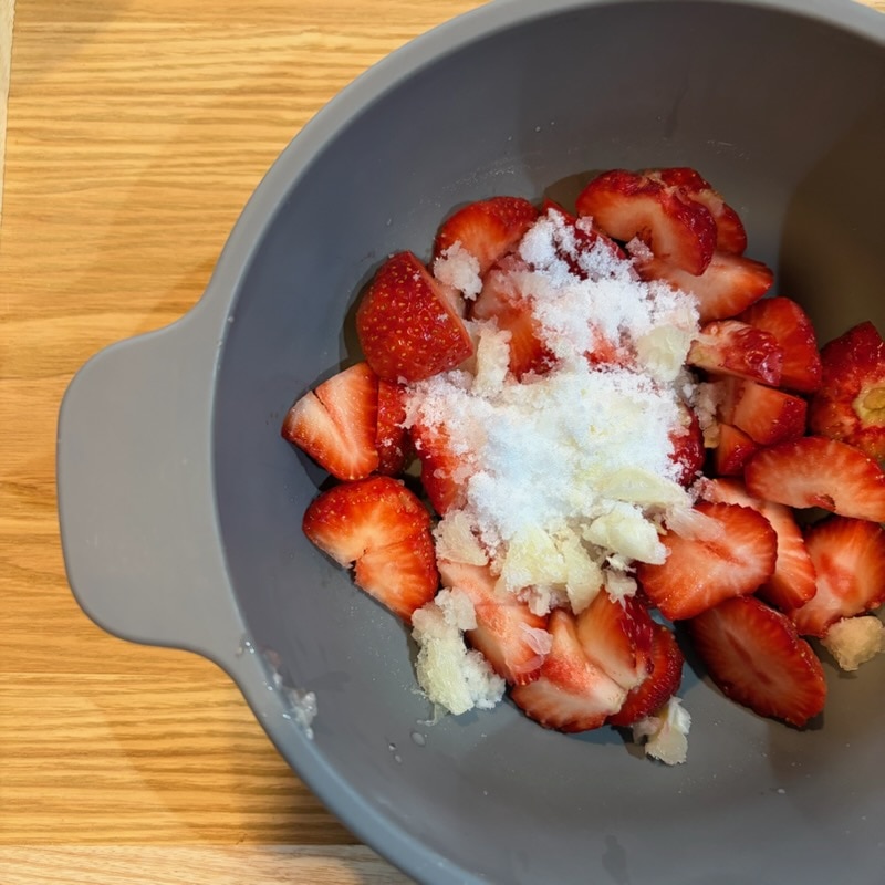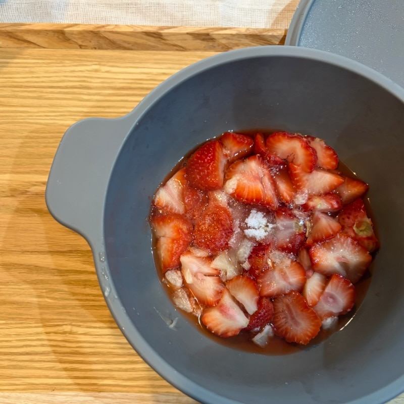 ①いちごのへたを取り1㎝角に切り、大きめの耐熱ボウルに入れ、砂糖とレモン果汁を入れて混ぜる