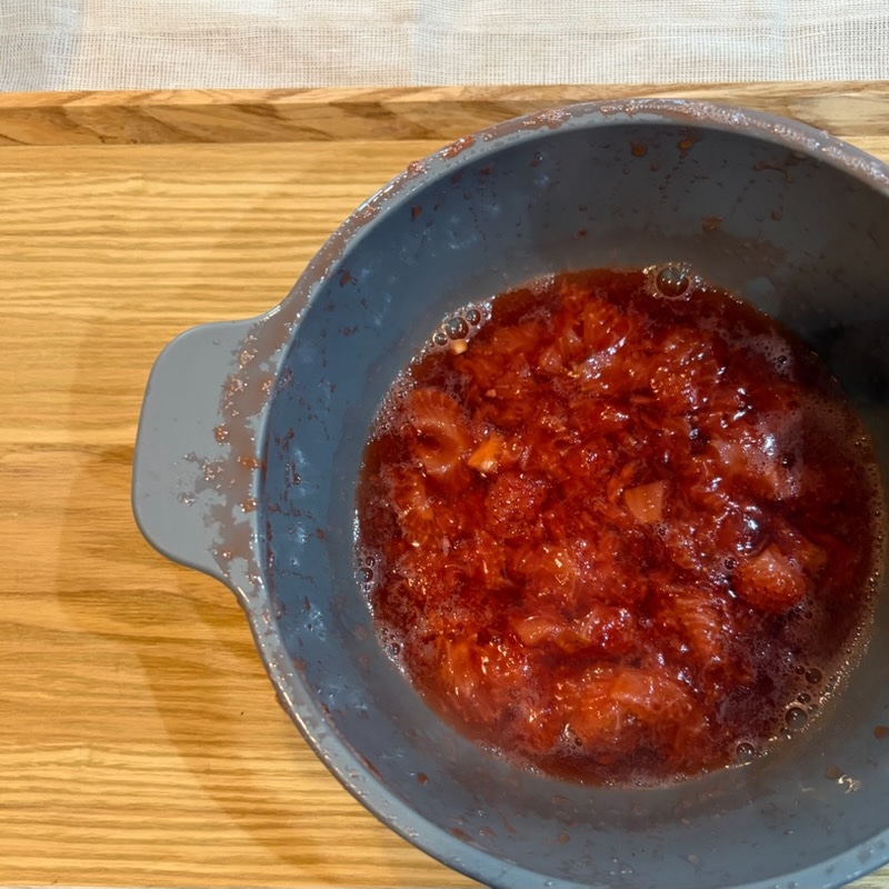 いちごソースは加熱すると沸騰するので大きめのボウルを使います