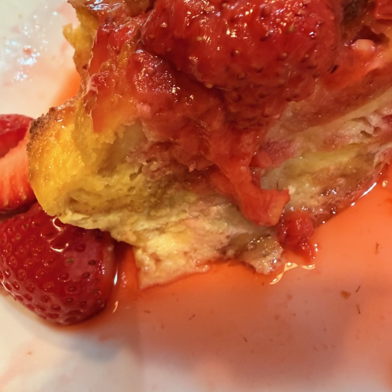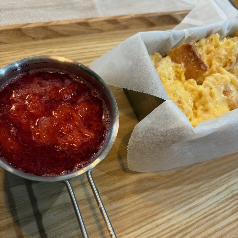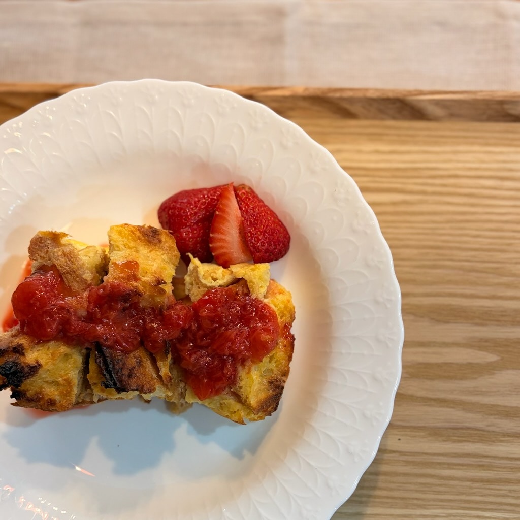 いちごと冷凍していたバケットもあったので「いちごソースをかけるパンプディング」を作りました。