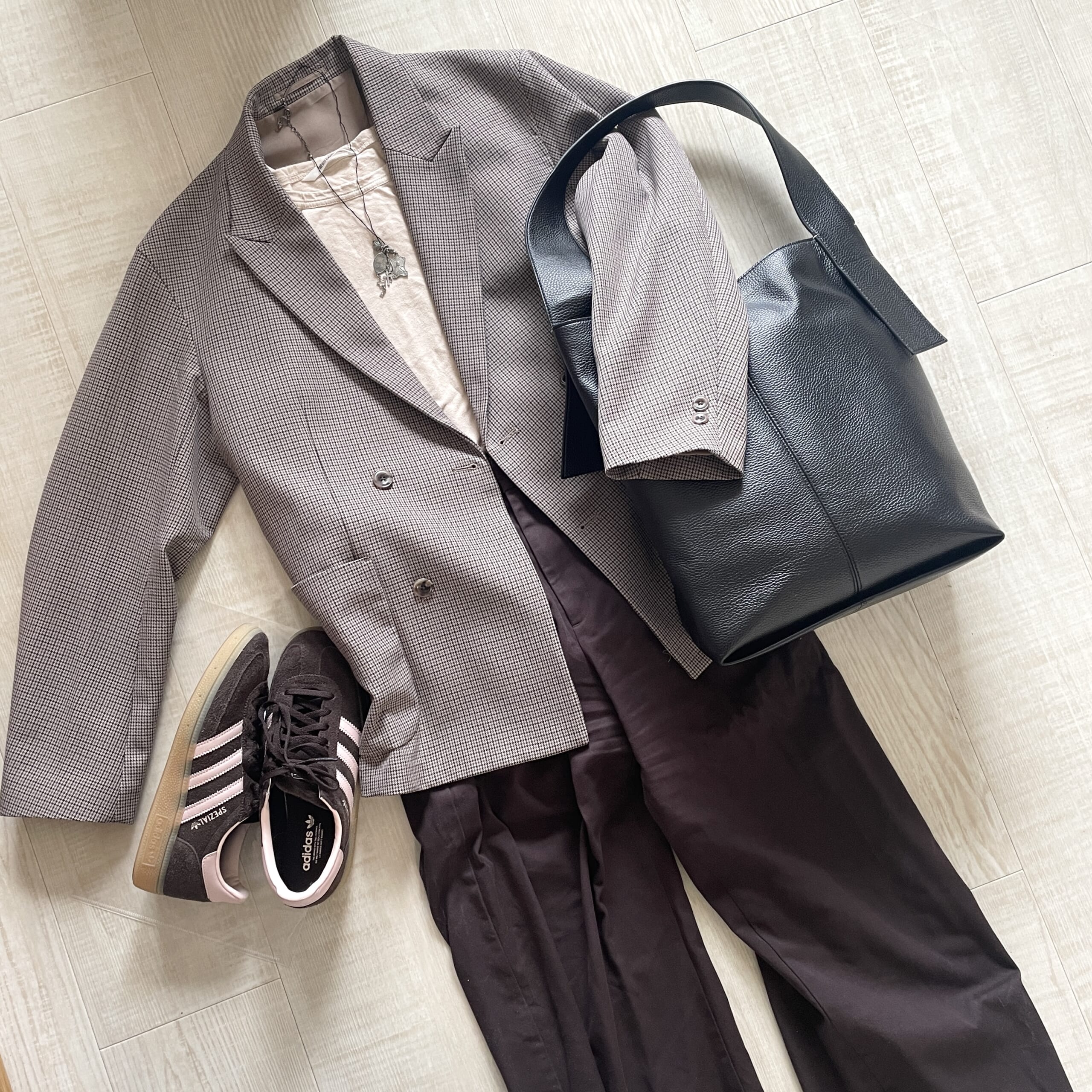 【通勤コーデ】チェックジャケットとブラウンパンツ