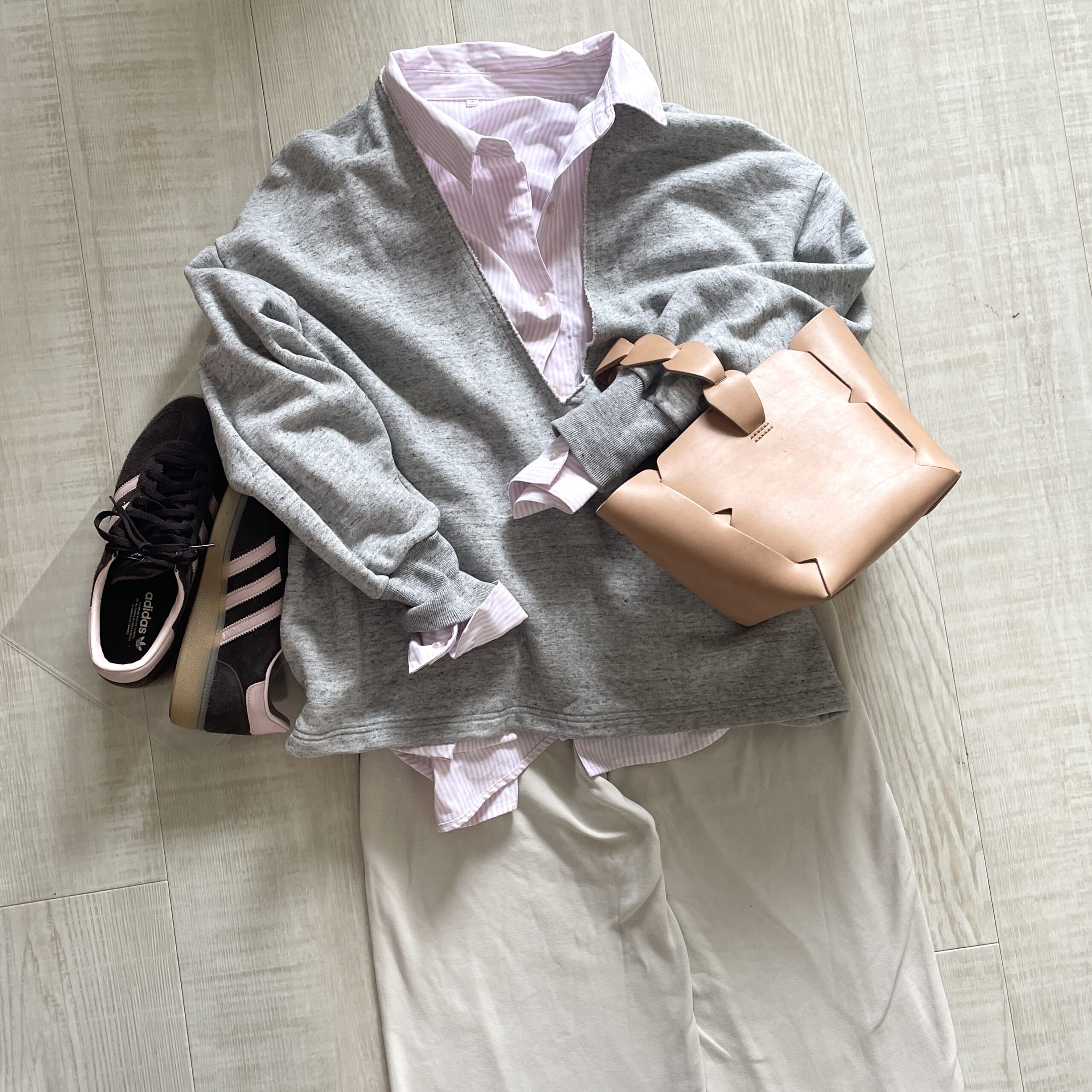 グレーと合わせるのはどうかな…?と思ったのですが、アリかなと。ボトムスもリラックスモードでスウェットです。濃い色なので、スウェットのゆるさをキュッと引き締めてくれる気がします。