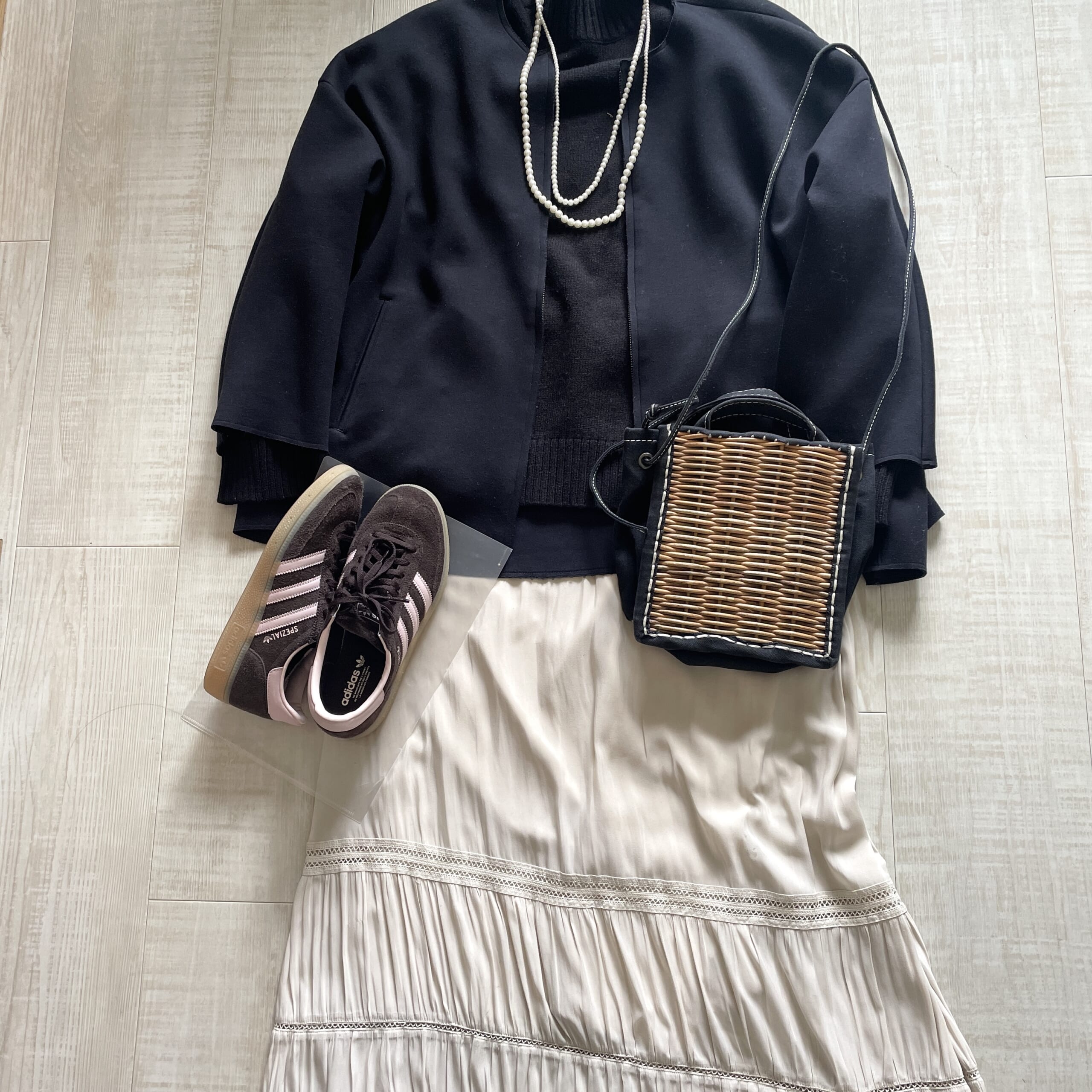 モノローンコーデに一点加えるだけで、レトロなスニーカーなのでカゴバッグとも相性良しです。