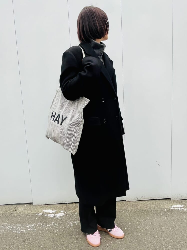 でも、ベースがモノトーンのコーデだからこそ、足元のピンクが映えて、コーデの印象が明るくなりました。