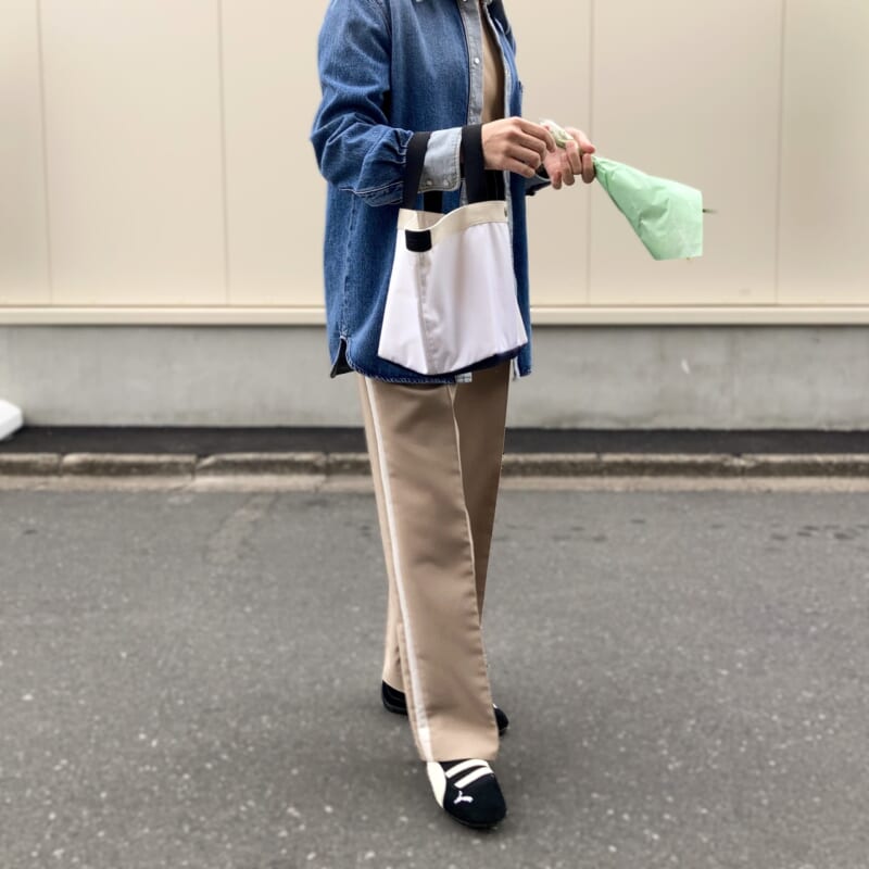 まだ肌寒い時間帯も多いので、靴下必須で足元はスニーカーに。スニーカーをローファーにすればひとり時間にも◎