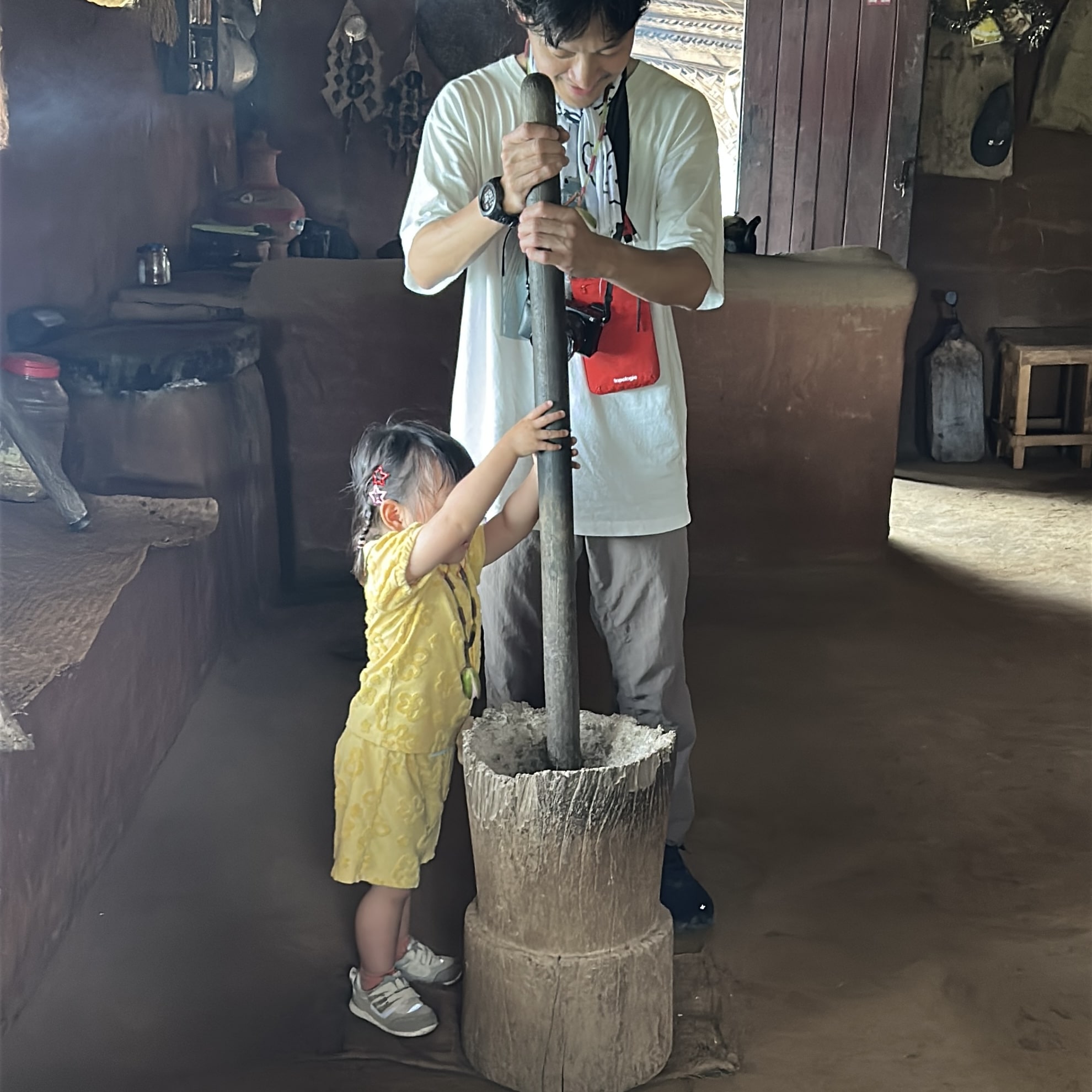 お米?みたいなものを砕いていく作業。トーントーントーンってな感じでリズミカルに棒を落とすことでいい感じに砕けるよう。