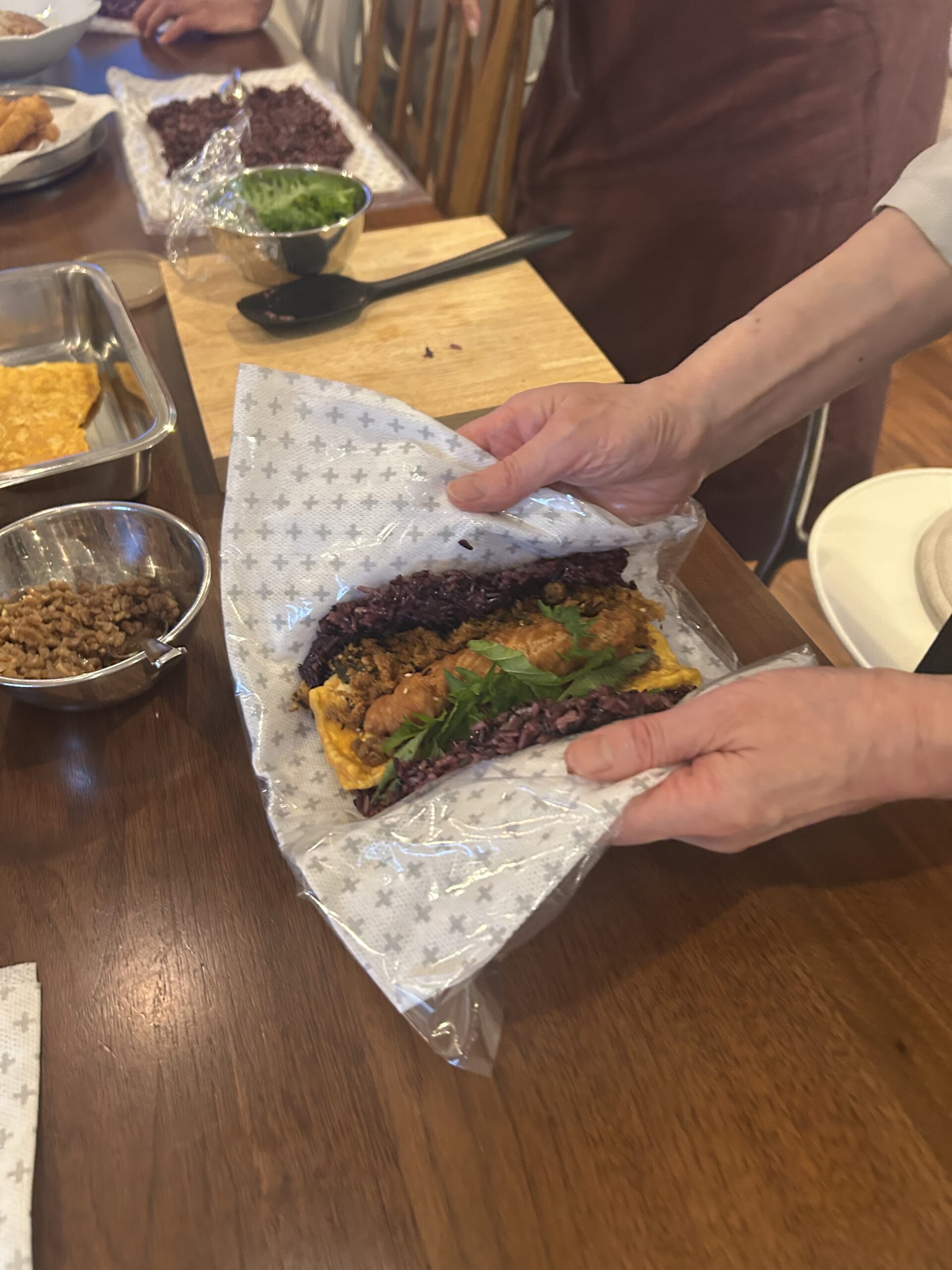 台湾のおにぎりのような食べもので、もち米の中に揚げパン、卵、ロウソン(ポークフレーク)、酸味のある大根漬けをぎゅっと包みます