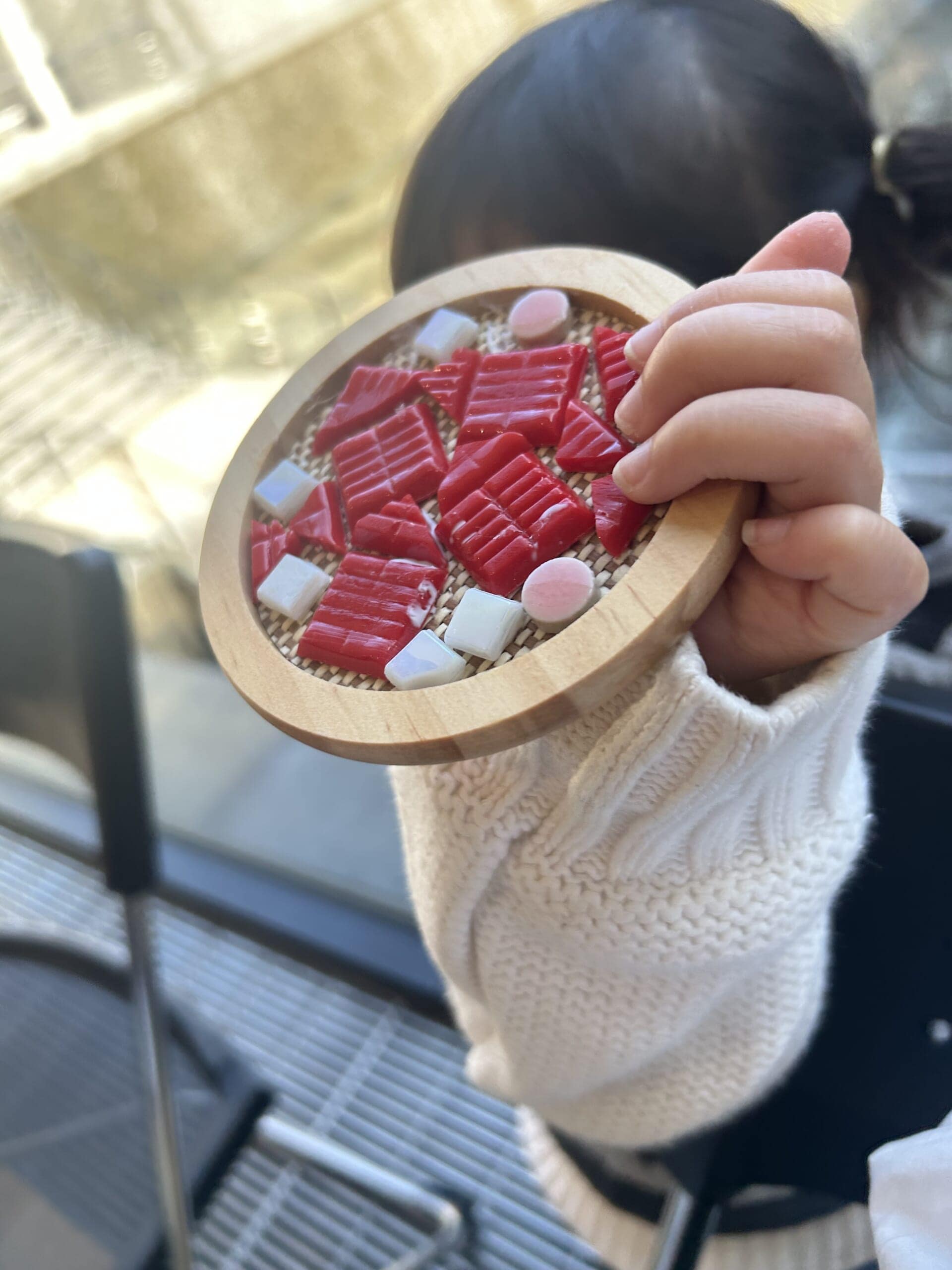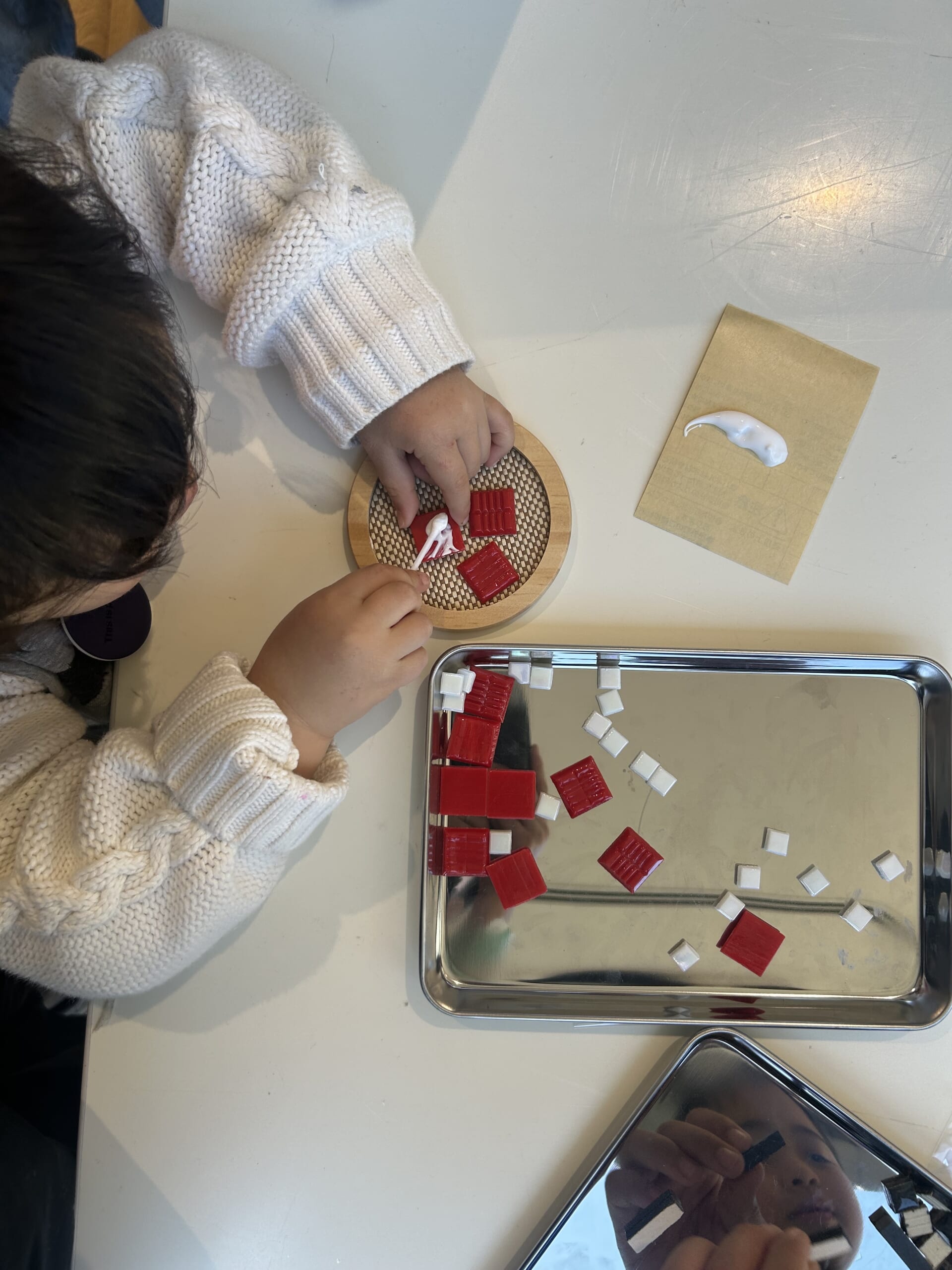 子どもたちは、タイルを使ったコースターづくりのワークショップへ。