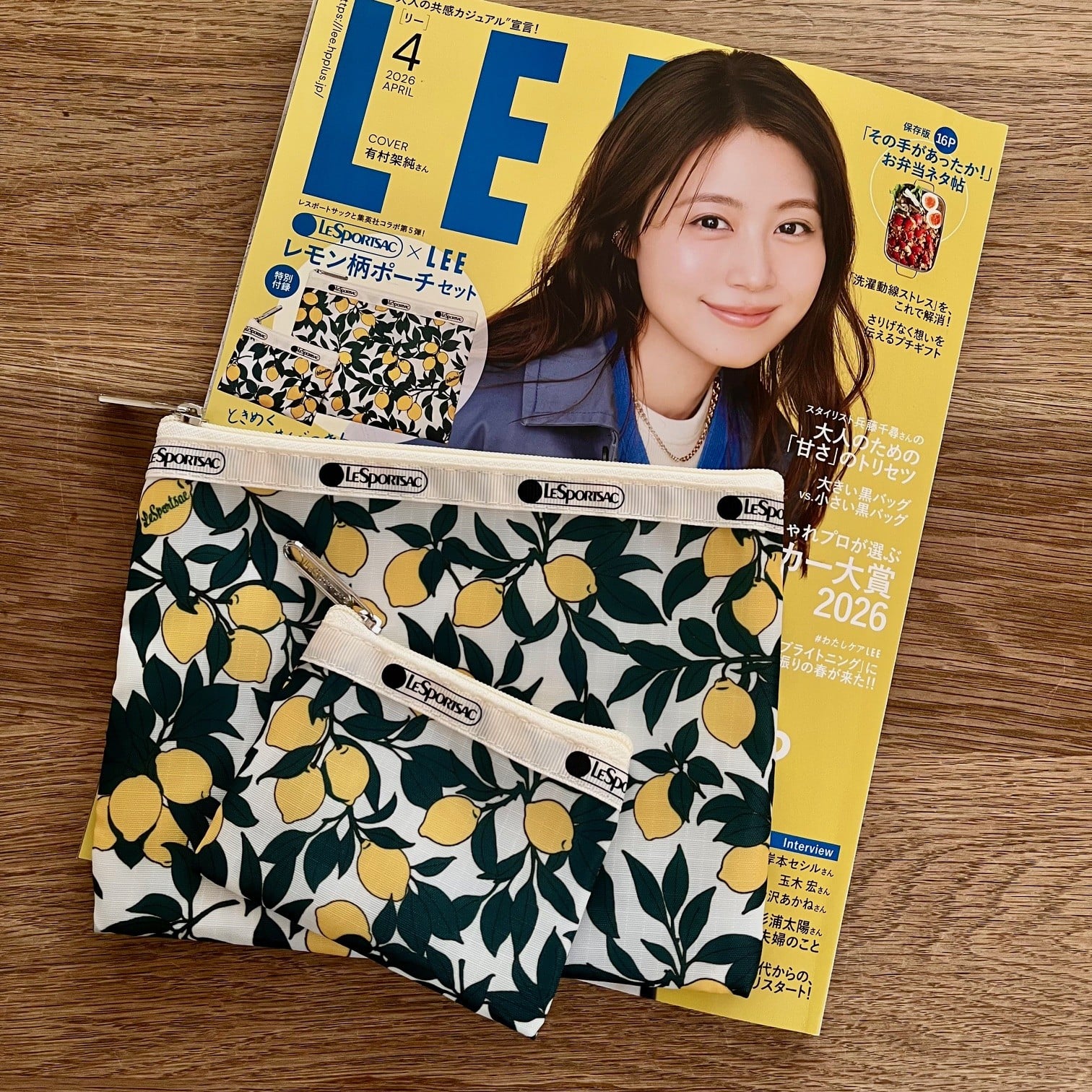 ぱっと目を引く有村架純さんの笑顔と、鮮やかなイエローカラーの表紙、そしてLeSportsacのレモン柄ポーチの付録…そして中身も大充実のLEE4月号。