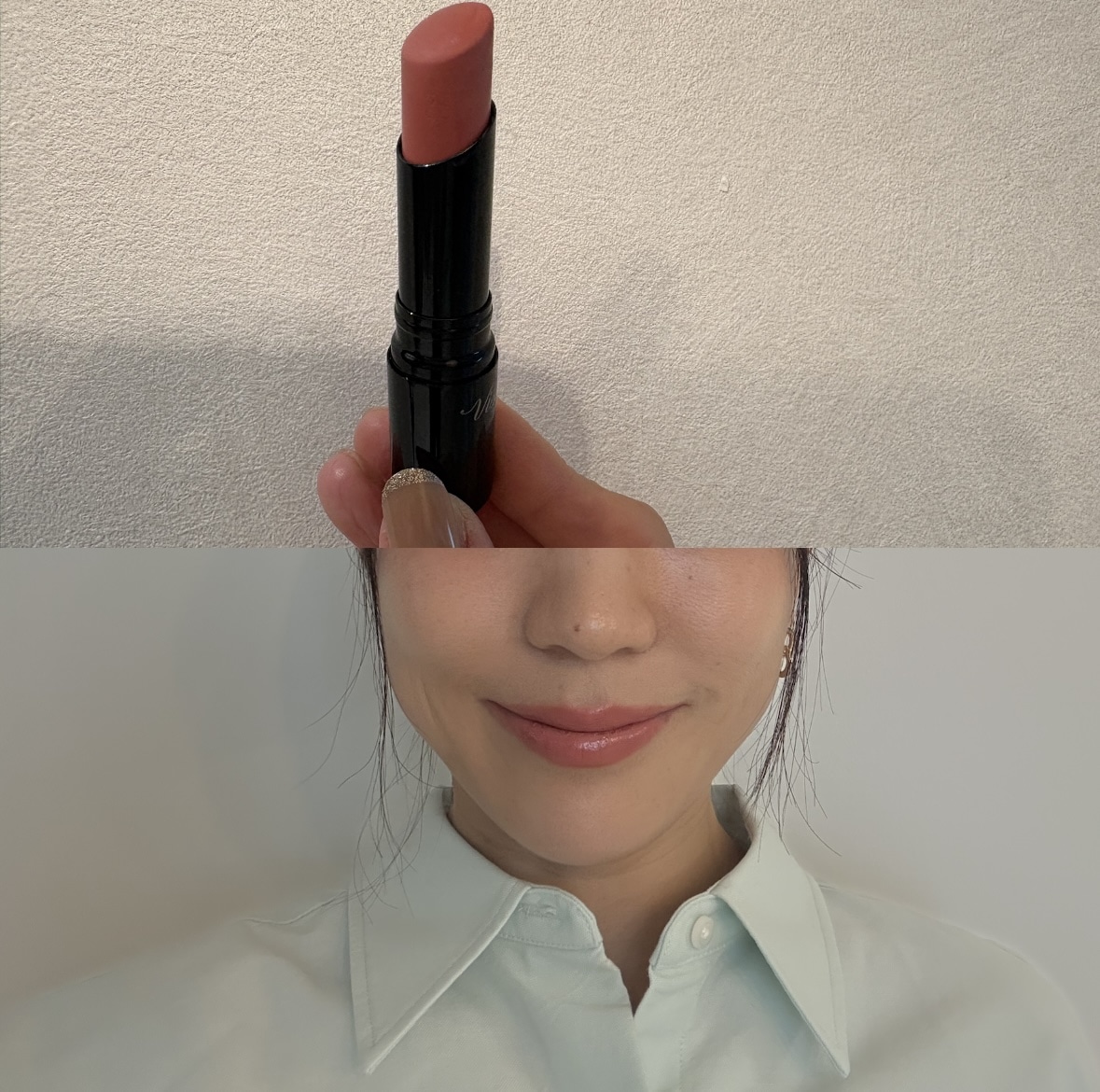 一度塗りだと透け感ある薄いピンクに。こちらは、2度塗りをした写真ですが、しっかり発色します。普段使いにすごくいい色味でかわいいです。いつもマスクを外すと、パリパリに乾燥しているのですが、潤い成分も配合ということで、乾燥しにくく感じました。