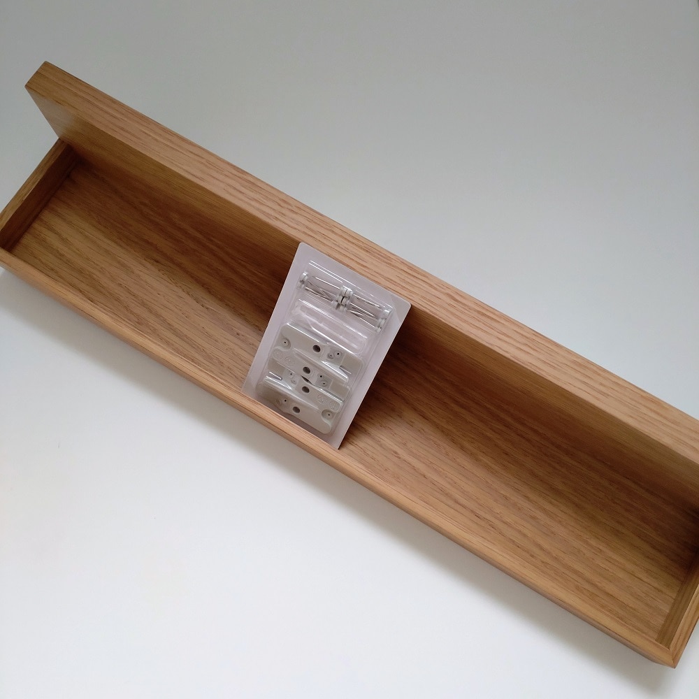 私のミシン部屋は床がオーク材なので、素材を合わせてオーク材突板の幅44×奥行10×高さ8cmものを選びました。