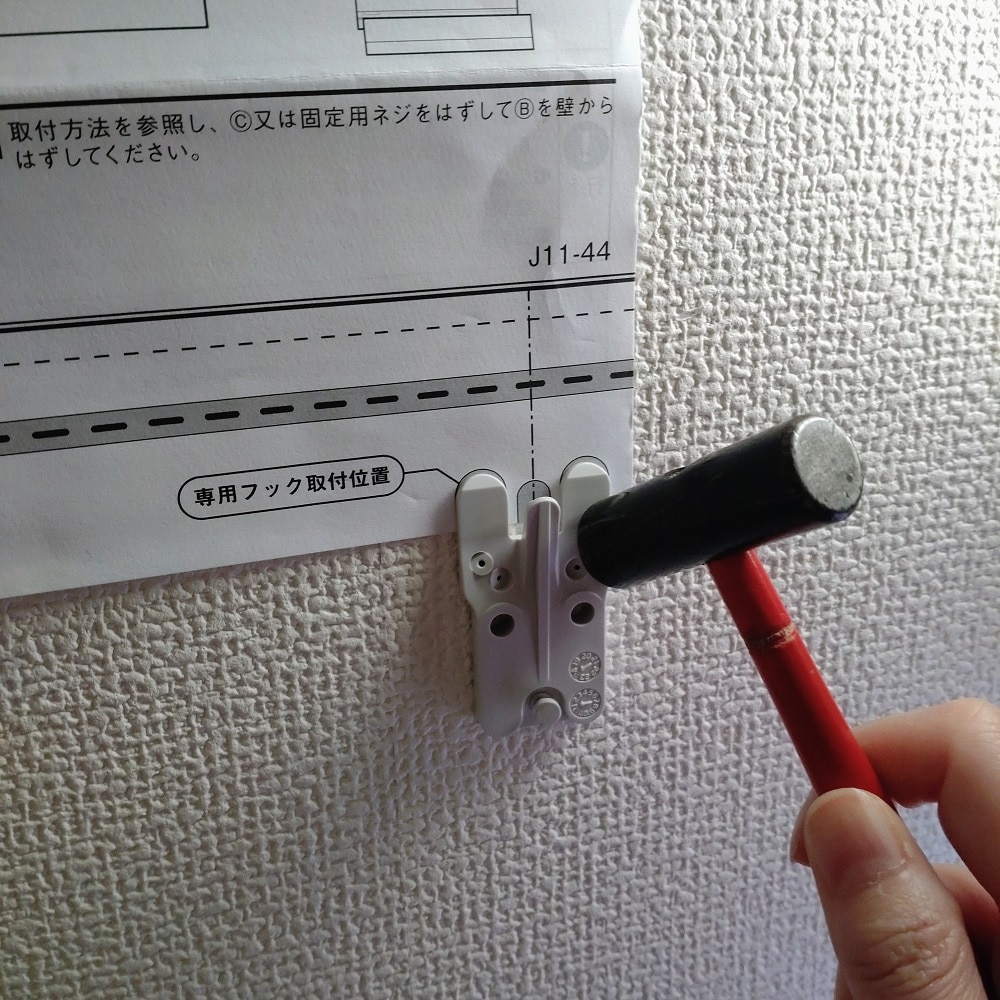 ガイドとなる説明書をテープで壁に貼って、ピン止めするだけ。我が家の壁は外側の固い部材だったので、ミニトンカチを使いました。付属のピンを差し込み5分程で完成です。