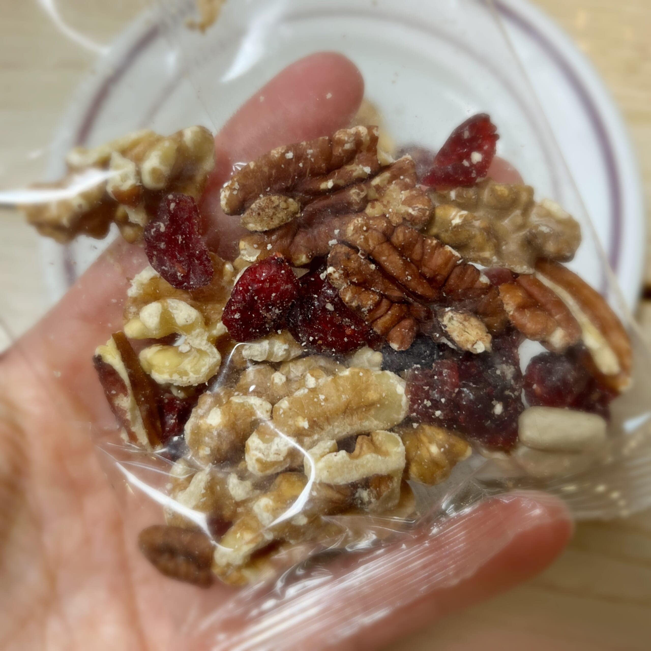 いつも、のアイテムにプラスしたのは、栄養たっぷりの罪なきおやつ!くるみ&グランベリー。