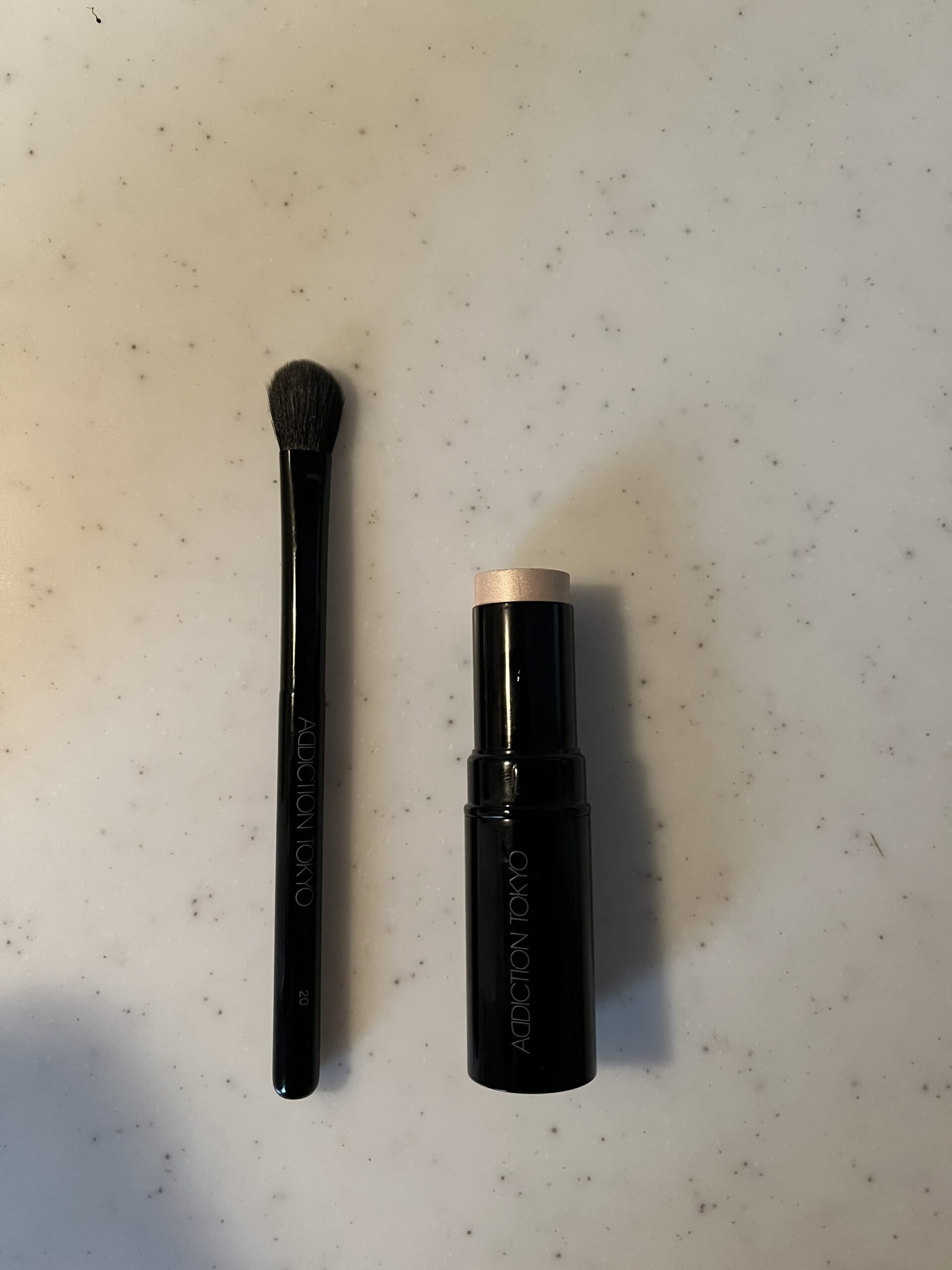 スティックハイライター。超繊細パールで自然にライトアップしてくれます。私は眉下、目の下に塗っています。自然な艶が出て目元の印象が大分変わる気がします。鼻筋や口元に塗っても良し。直塗りもオッケーですがブラシの方がしっかり定着してくれるということで、ブラシも一緒に購入しました。