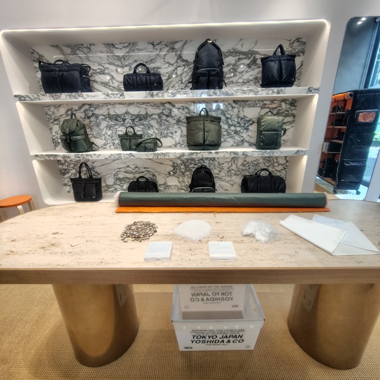 正面の大理石の棚には、『TANKER』シリーズがズラリ。100%植物由来ナイロンを使用しているという説明がテーブルの上にありました。