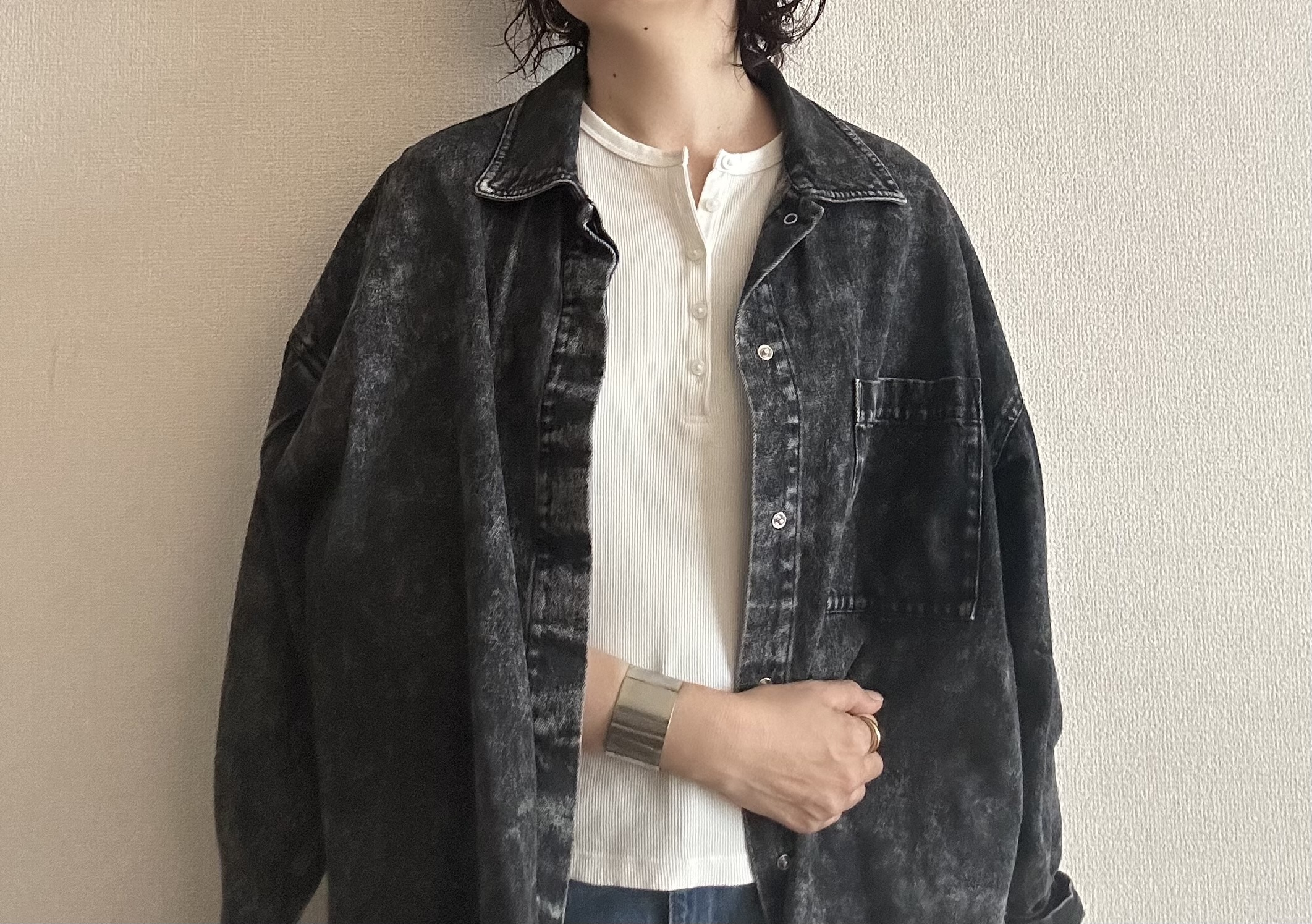 普段着に使えそうやなぁと思ったのと、1枚でもサマになるヘンリーネックに惹かれて購入しました。そのまま、その日着ていたシャツの中に即投入。笑