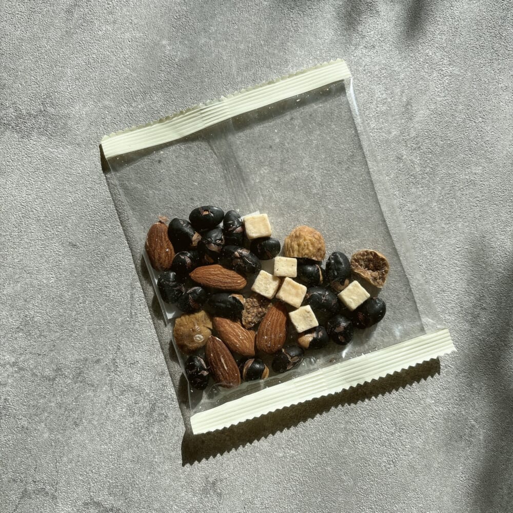 黒豆&チーズという商品名ですが、中には黒豆とチーズの他に素焼きアーモンドとドライいちじくも入っている。食塩なども使わず、シンプルに素材そのまま。
