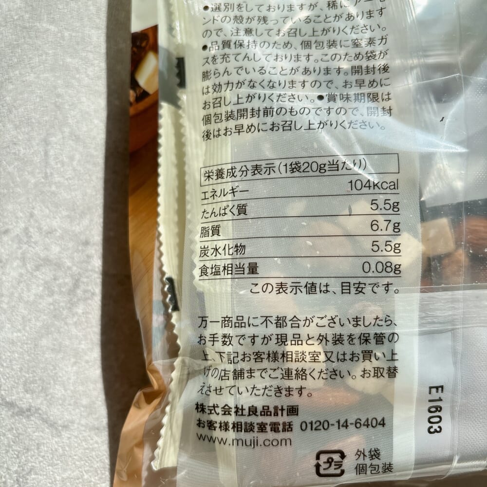 大袋の中に小分けで7袋入ってる。1袋20g入りで104㎉。たんぱく質は5.5g。