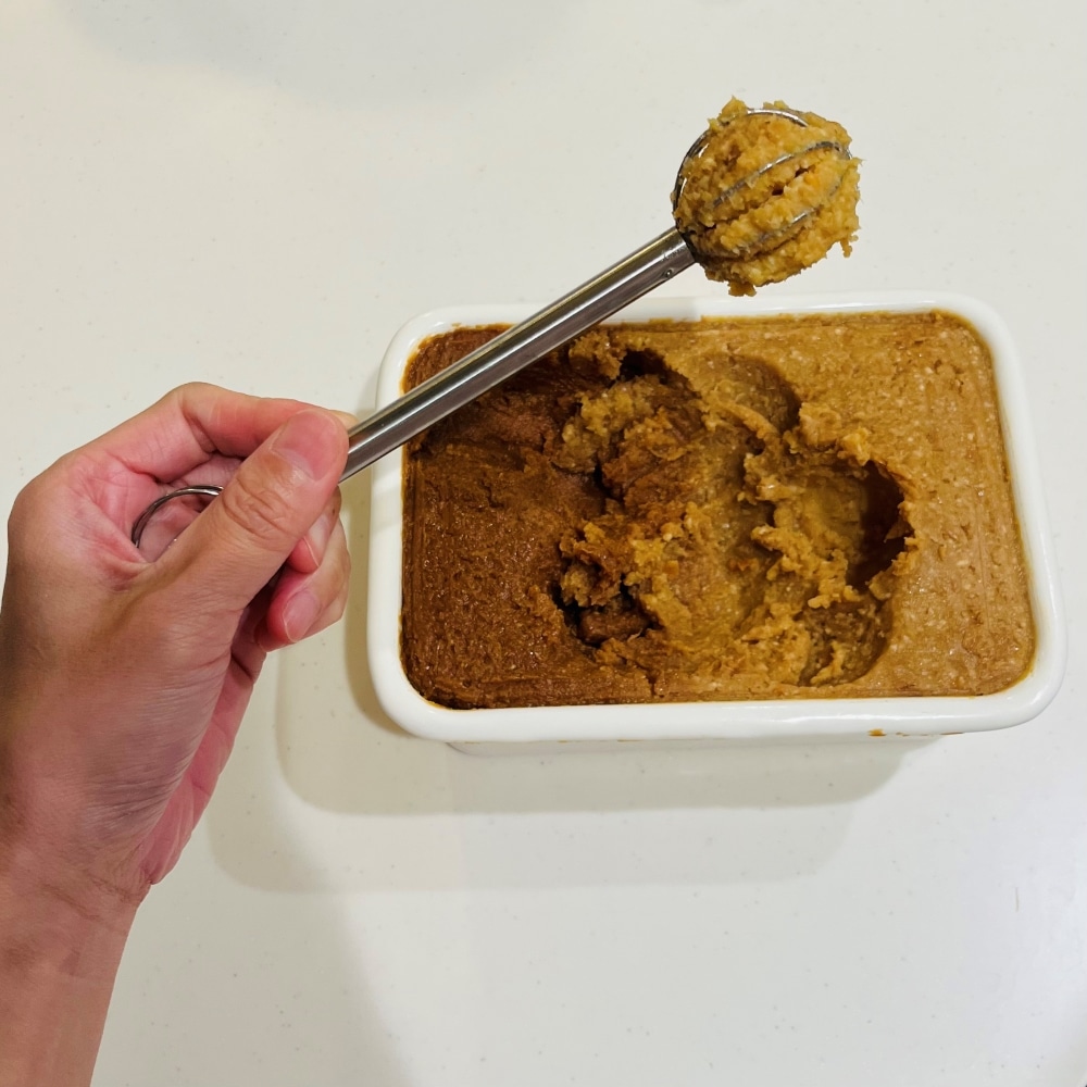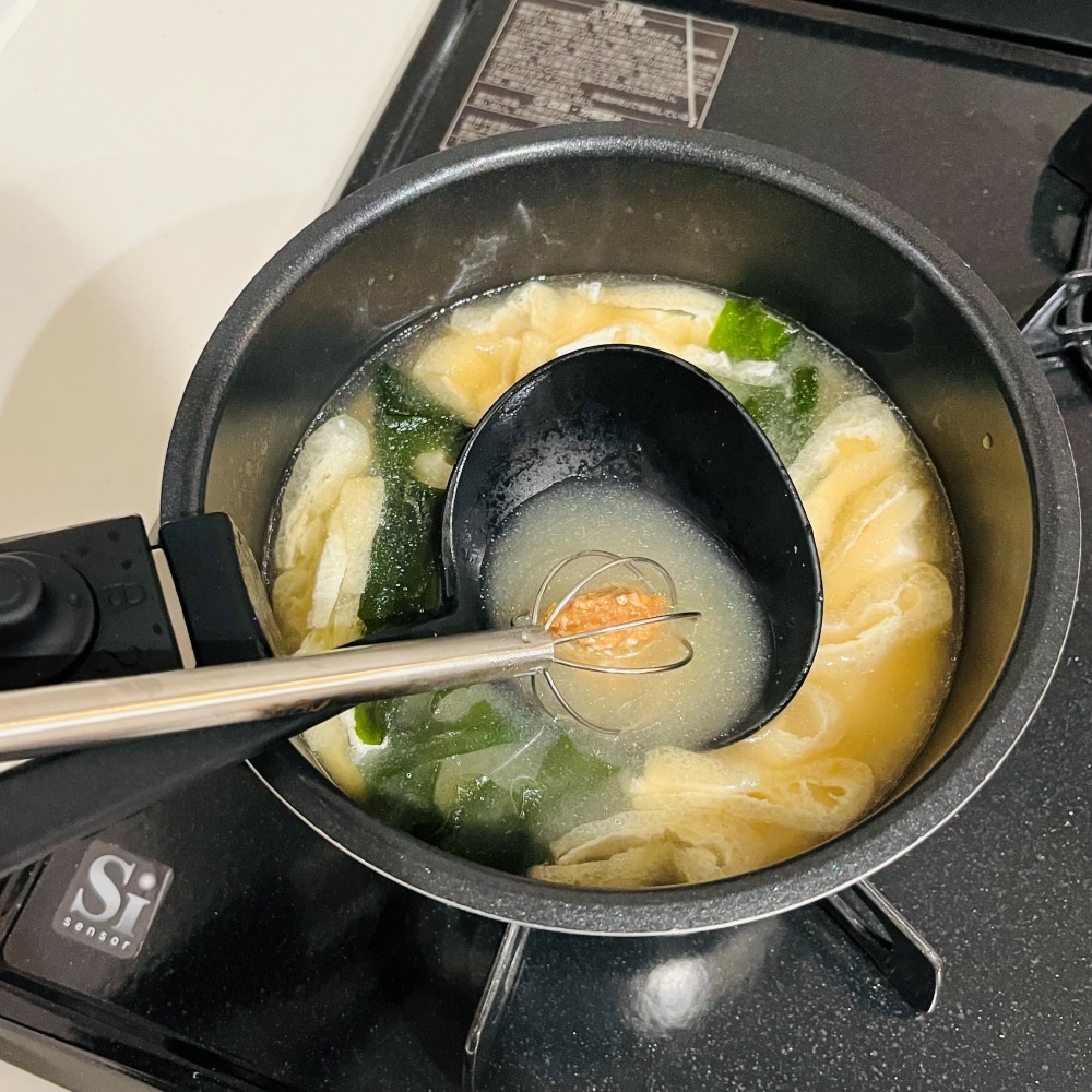 でも、この計量味噌マドラーを使い始めてから、先端のリングでくるんと味噌を回しとるだけ同じ分量を取ることができ、いつでも「安定の味」が作れるようになりました。