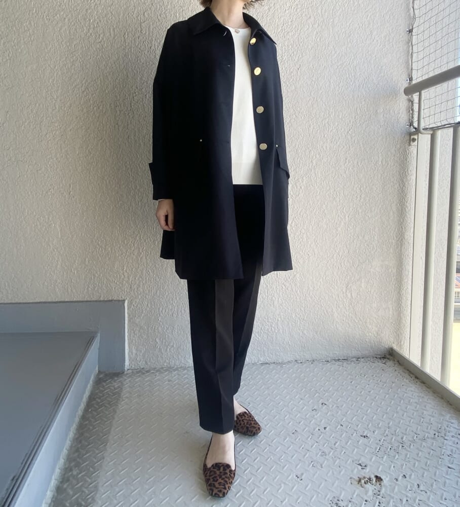 コートのAラインが活かせるよう、細身のパンツと合わせてすっきりと。