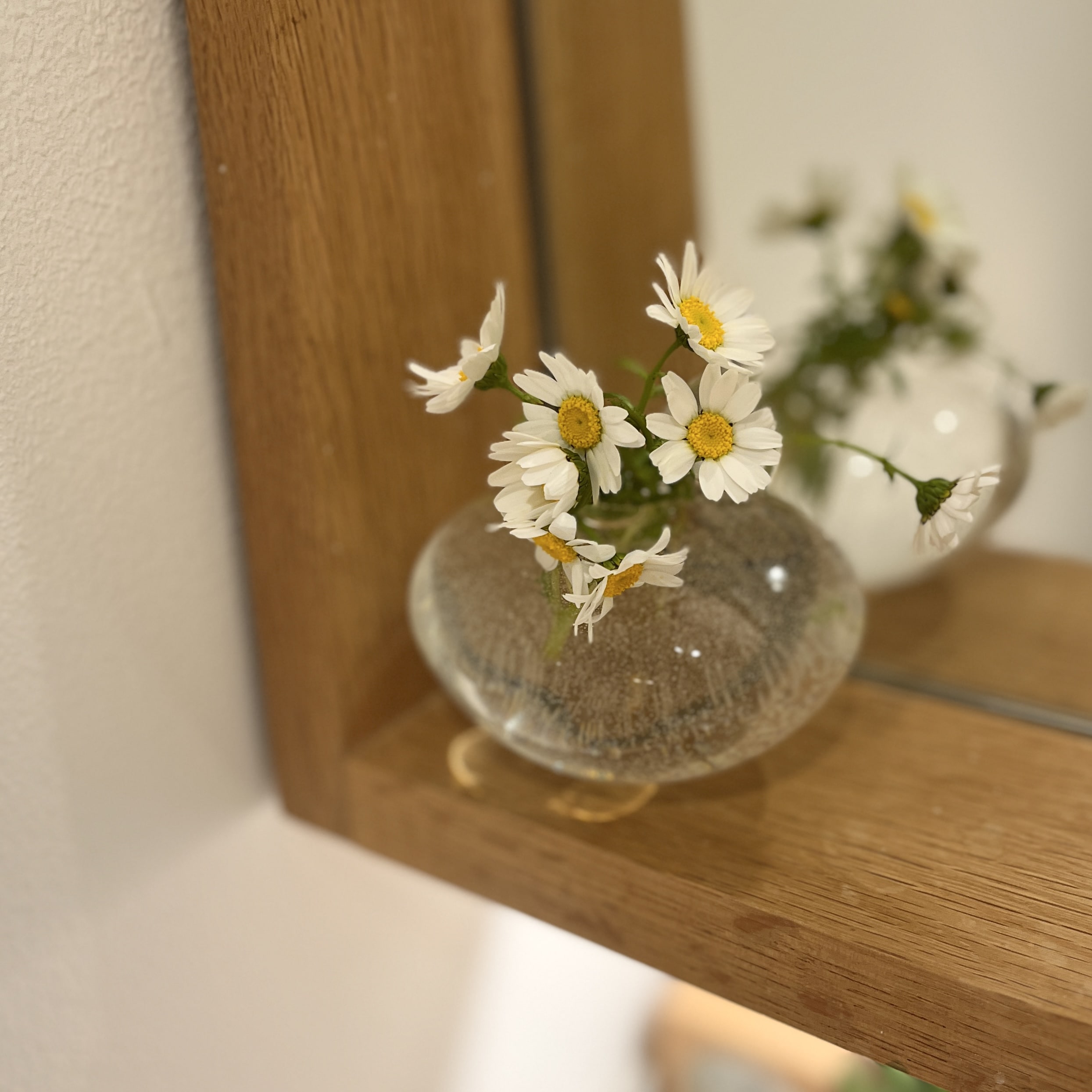 この丸みのある形には、曲線のあるお花が合いそうだな~と思って、マトリカリアを合わせてみました。