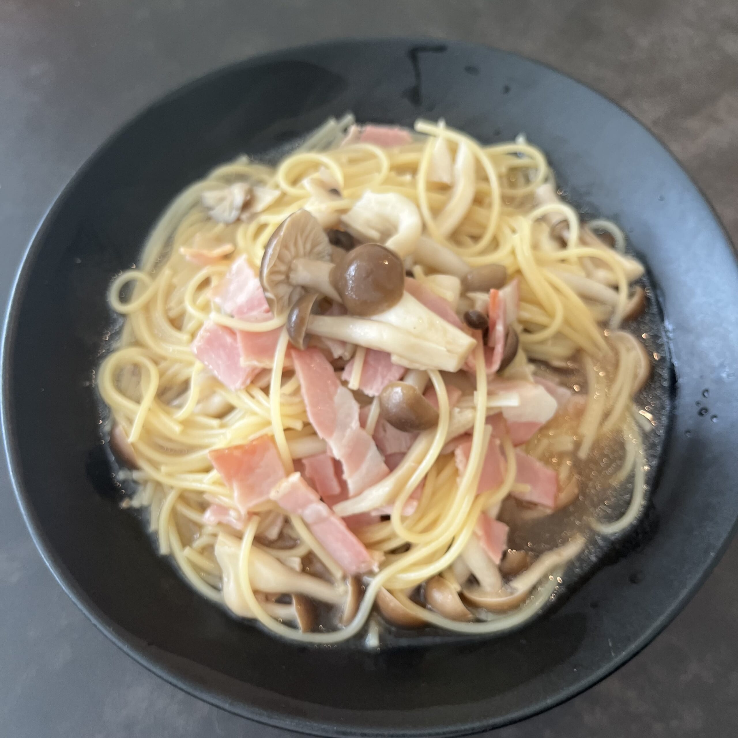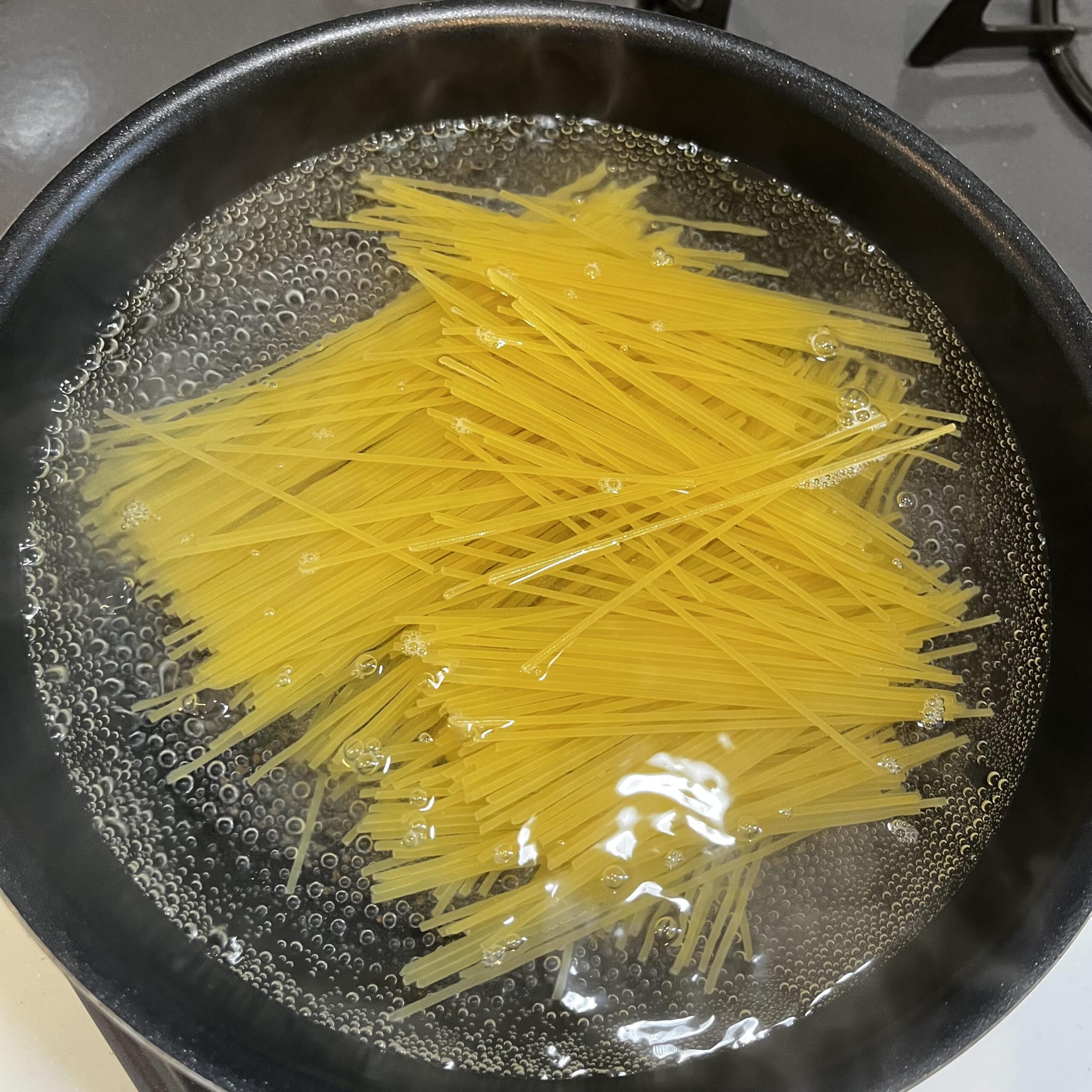 パスタが茹で上がる3分前にきのことベーコンを追加します。