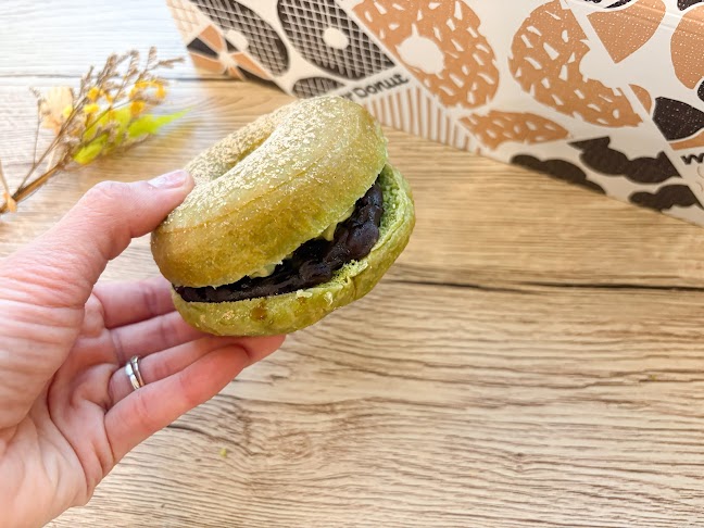 衹園󠄀辻󠄀利の宇治抹茶を使用したドーナツ。もちもち食感のドーナツ生地に、北海道産のあずき餡と宇治抹茶ホイップをサンドして、中には、黒みつをトッピング。和の食感が楽しめました!