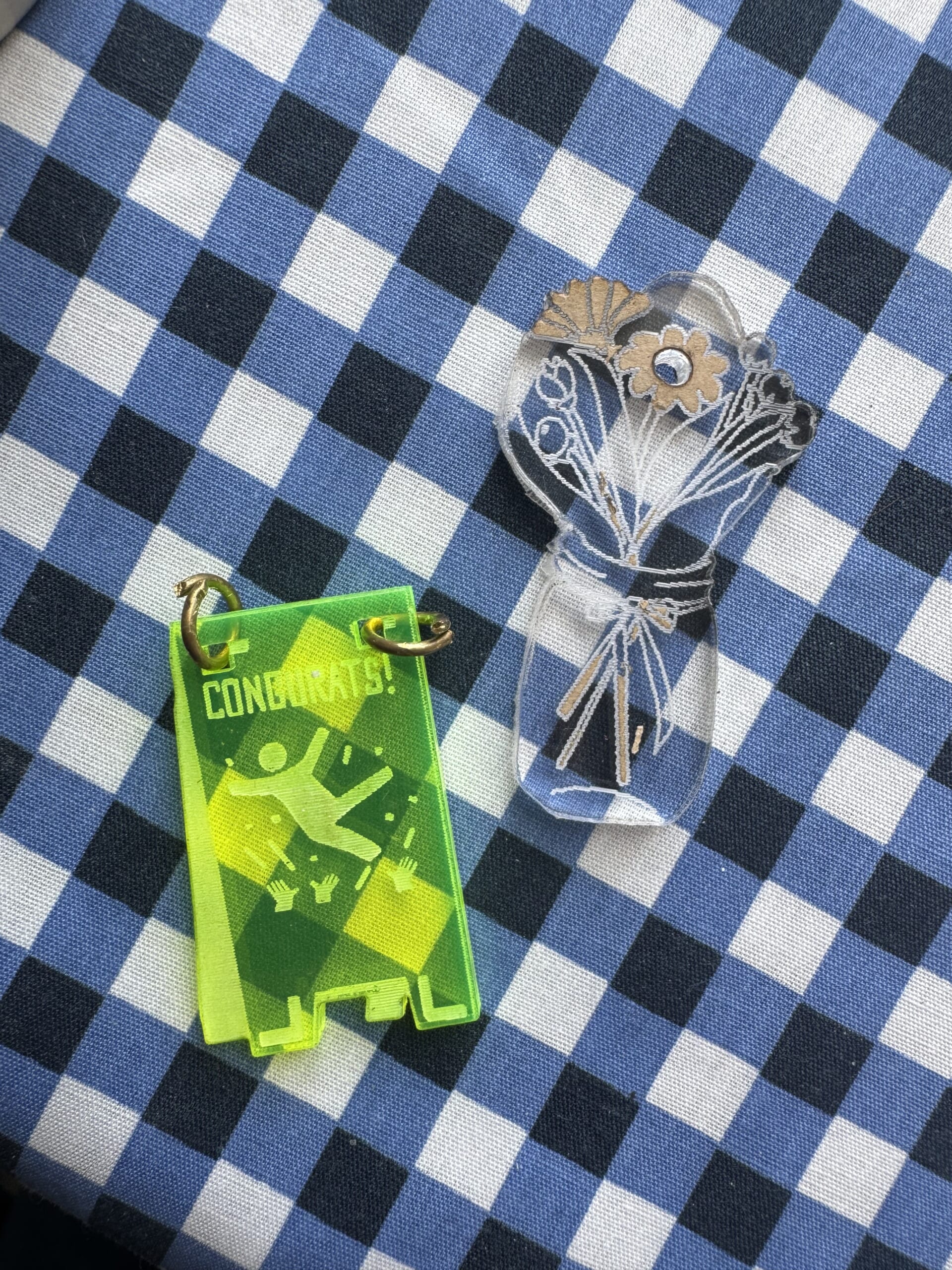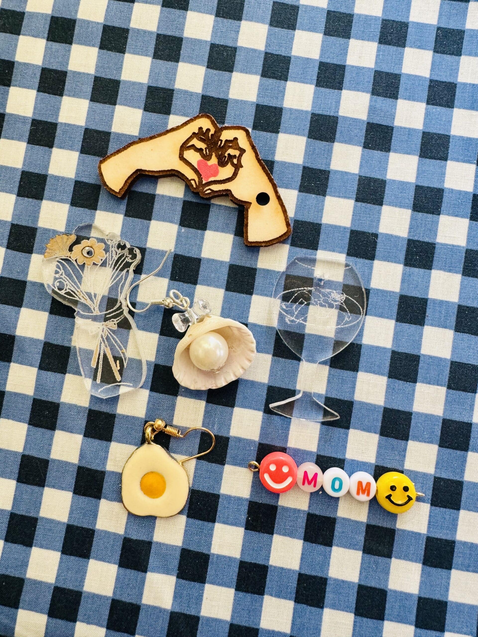 母の日が近いのでお花のモチーフと6月は卒業シーズンなのでcongrats! なパーツを作りました。ピアスにするかバッグチャームにするか迷い中