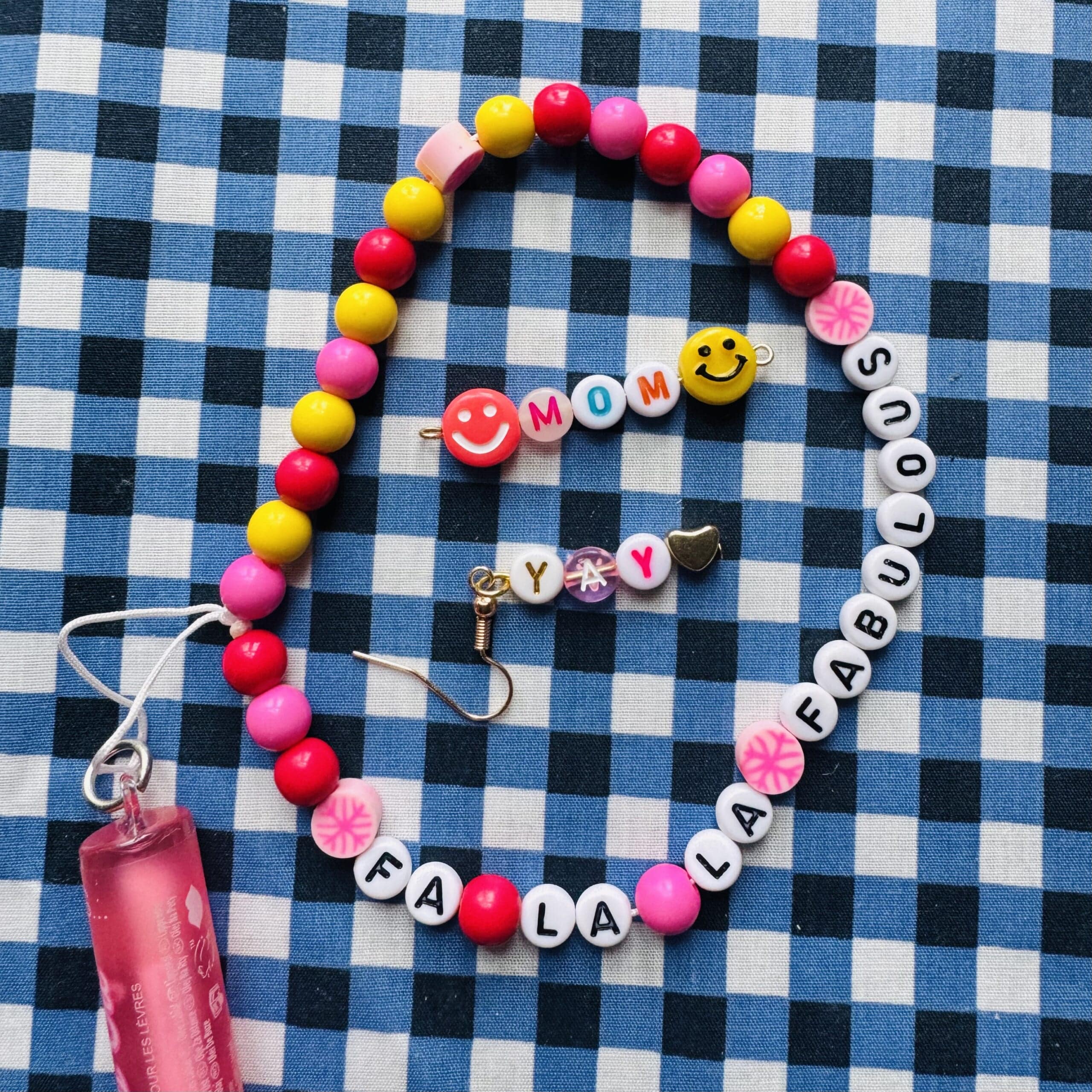 今も流行っているアルファベットビーズをつなげてアクセサリー作りに励んでいます。母の日も近いし、自分へのmom ペンダントとyay~!なピアスを。 周りに置いているファララファビュラスはリップグロスにくっついていた既製品です。(ファビュラスて😆)