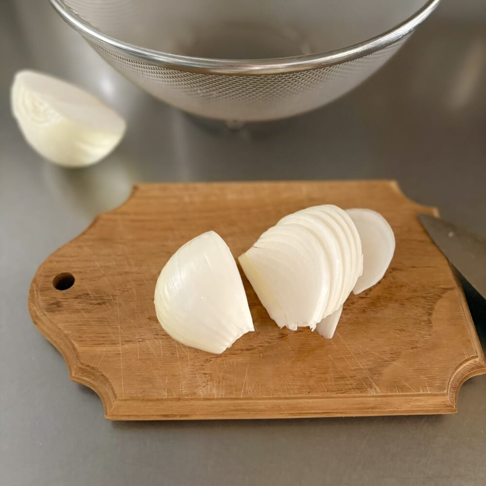 玉ねぎをサラダに使うときはいつも水にさらしていましたが、こちらのレシピでは「空気に触れさせる」とのこと。水にさらすより、栄養が流出しにくいそうです。