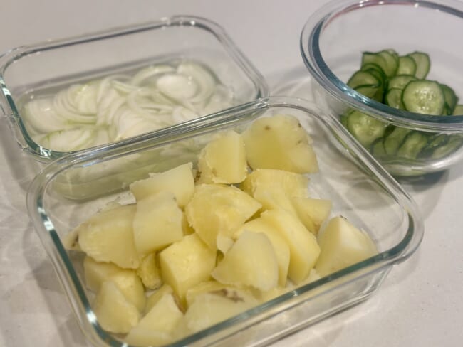 じゃがいもを加熱して、熱いうちに皮をむいてつぶして、きゅうりの塩もみをして、新玉ねぎをさらして……。 ひとつひとつの工程は難しくないのですが、やることは意外と多め!洗い物も多いですし。