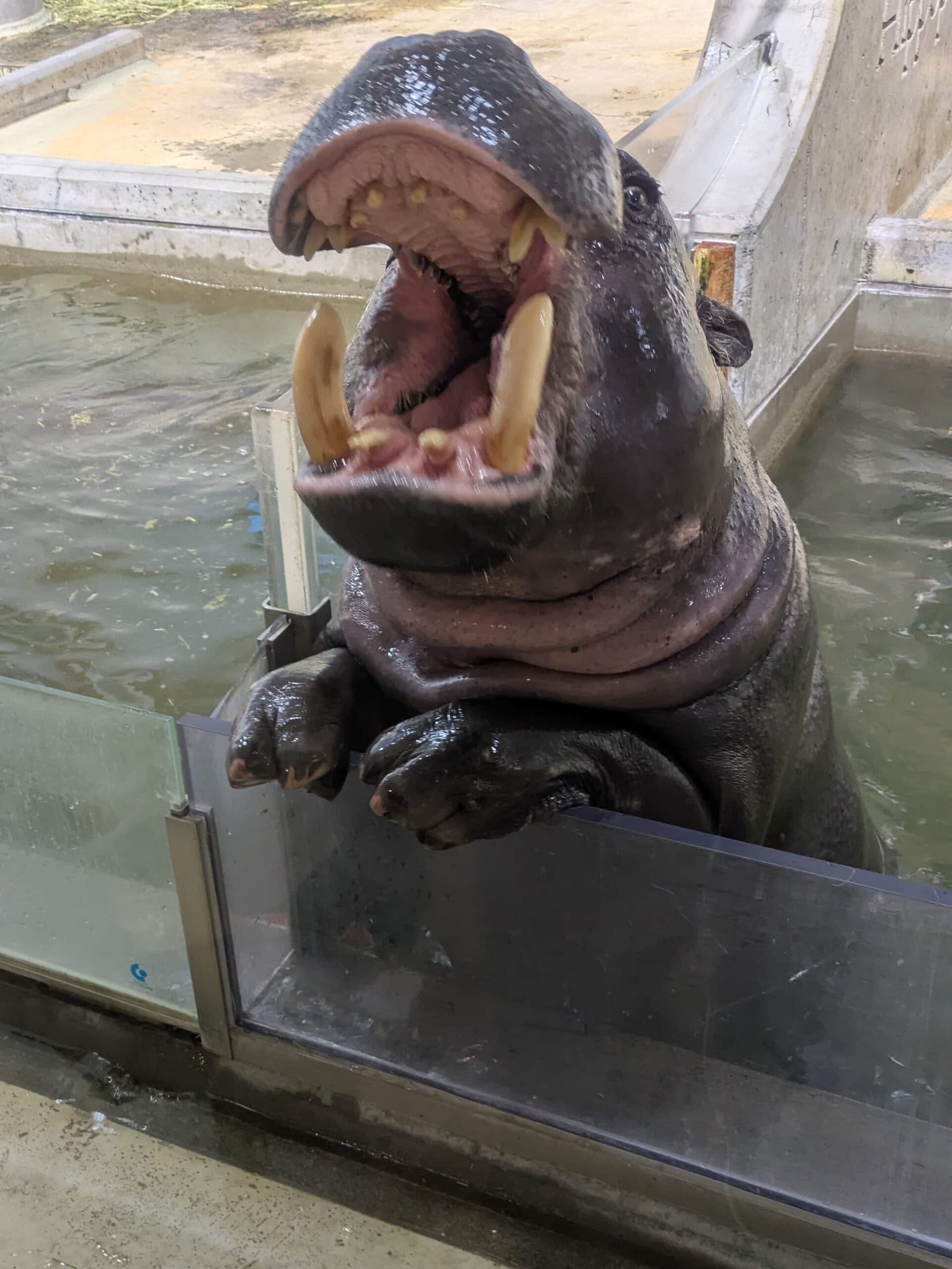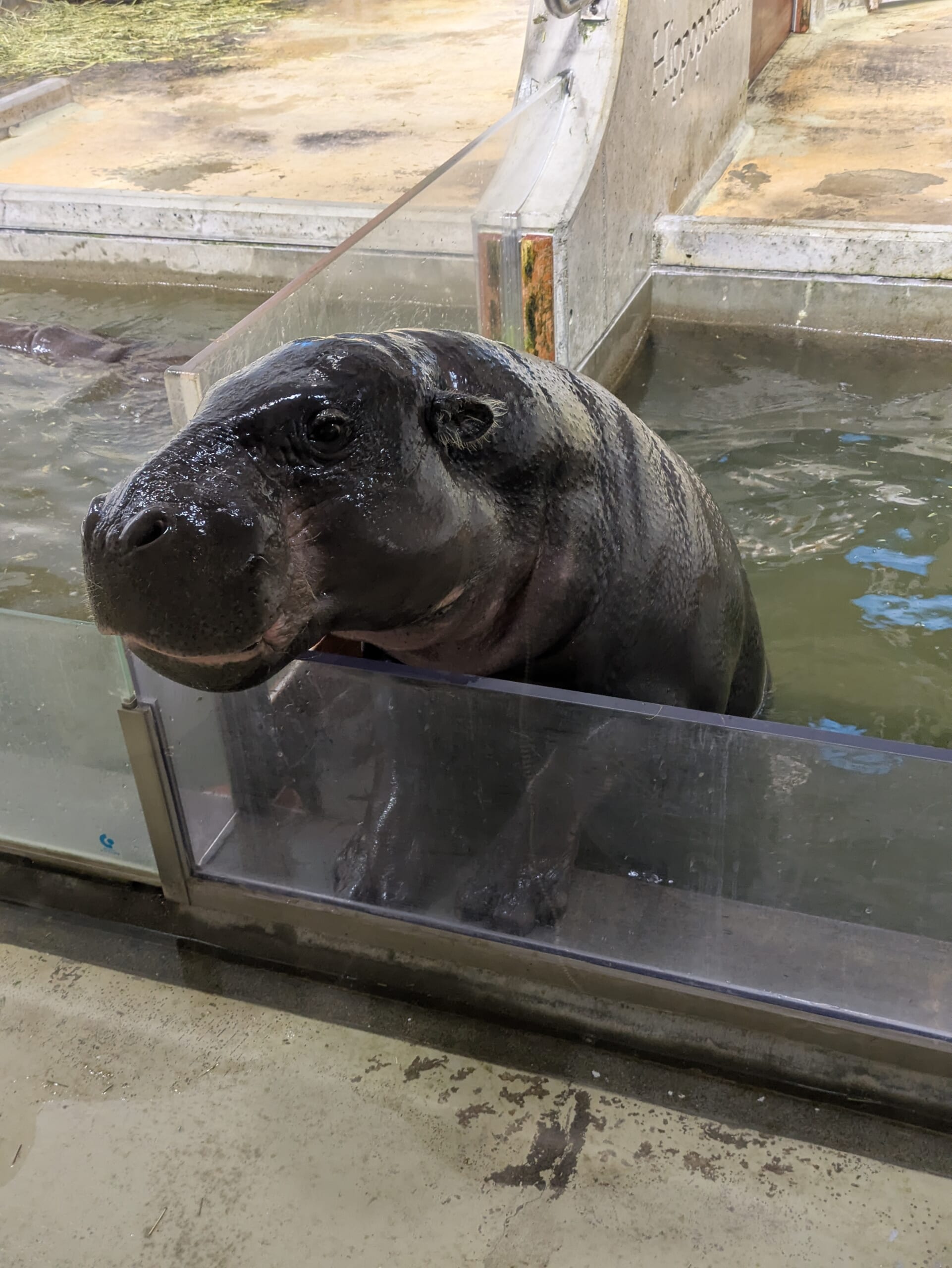 カバの半分ほどの大きさのコビトカバは、つぶらな瞳と大きな口で、ちびっこ達に大人気でした