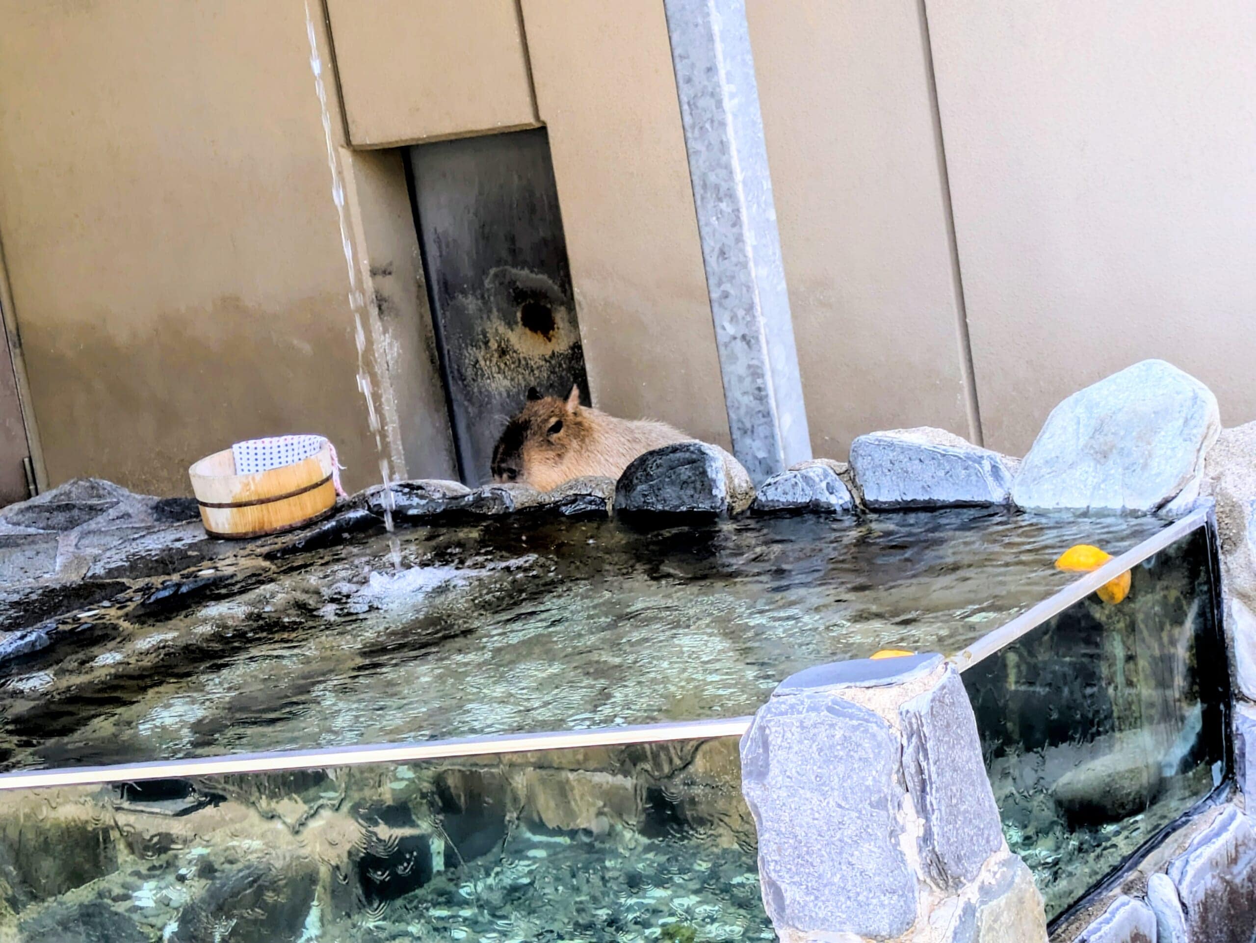 残念ながらこの日は温泉に入っているカピバラは見られませんでしたが、過去に来た時には高確率で入っていました♨
