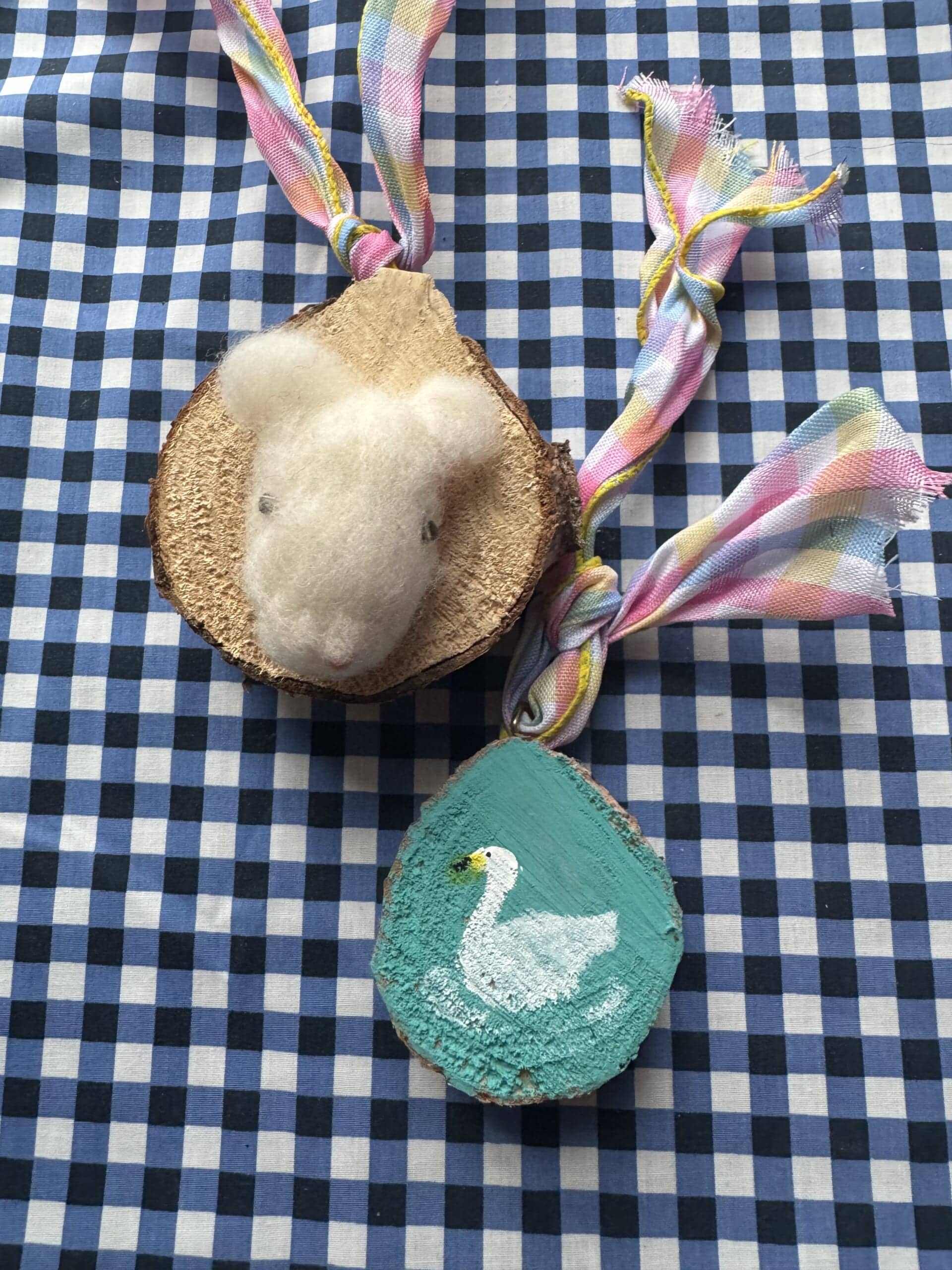 輪切り面に絵を描いたり、ニードルフェルトで作った何かを」ボンドで貼り付けて。