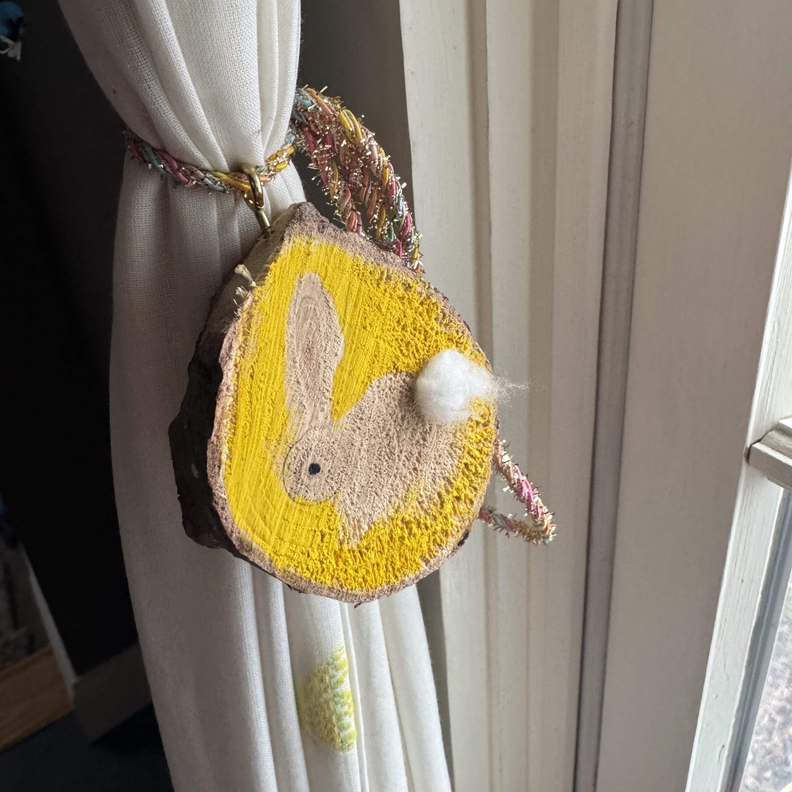 イースターが近づくとカーテンタッセルに、ツリー資材で作ったチャームをぶら下げています。